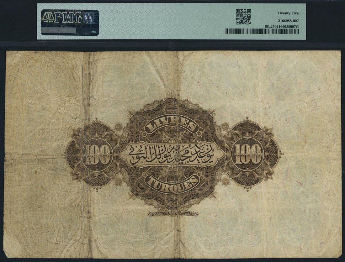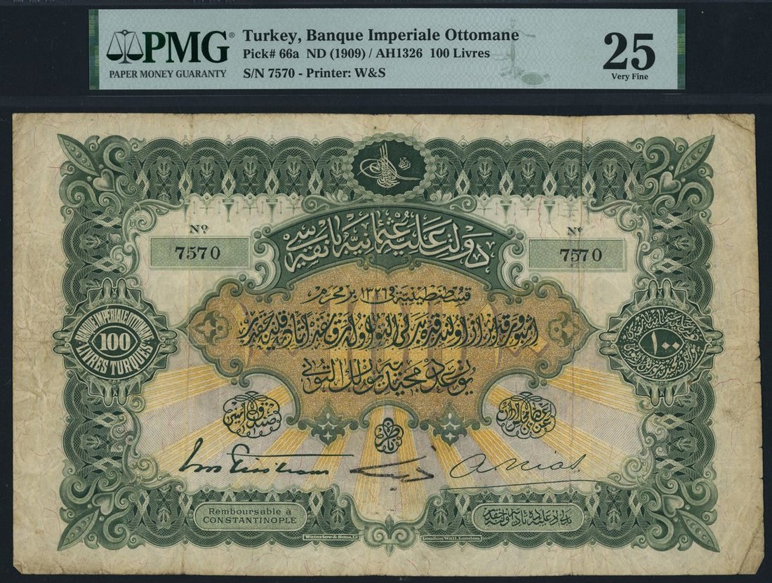 Banque Imperial Ottomane, Turkey, *TOP POP* 100 Livres, ND (1909), serial number 7570, (Pick 66a), in PMG holder 25 Very Fine. SCWPM states: "Issued Note. Rare" and lacks any catalogue illustration. Records show that only 2,000 notes were ever issued for this signature, and its significant purchasing power as the highest denomination of the series provides a compelling case for the survival of only very few issued examples.