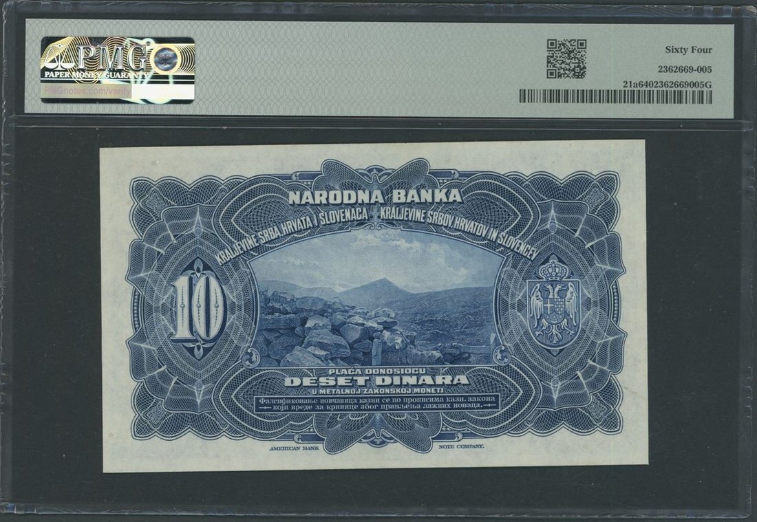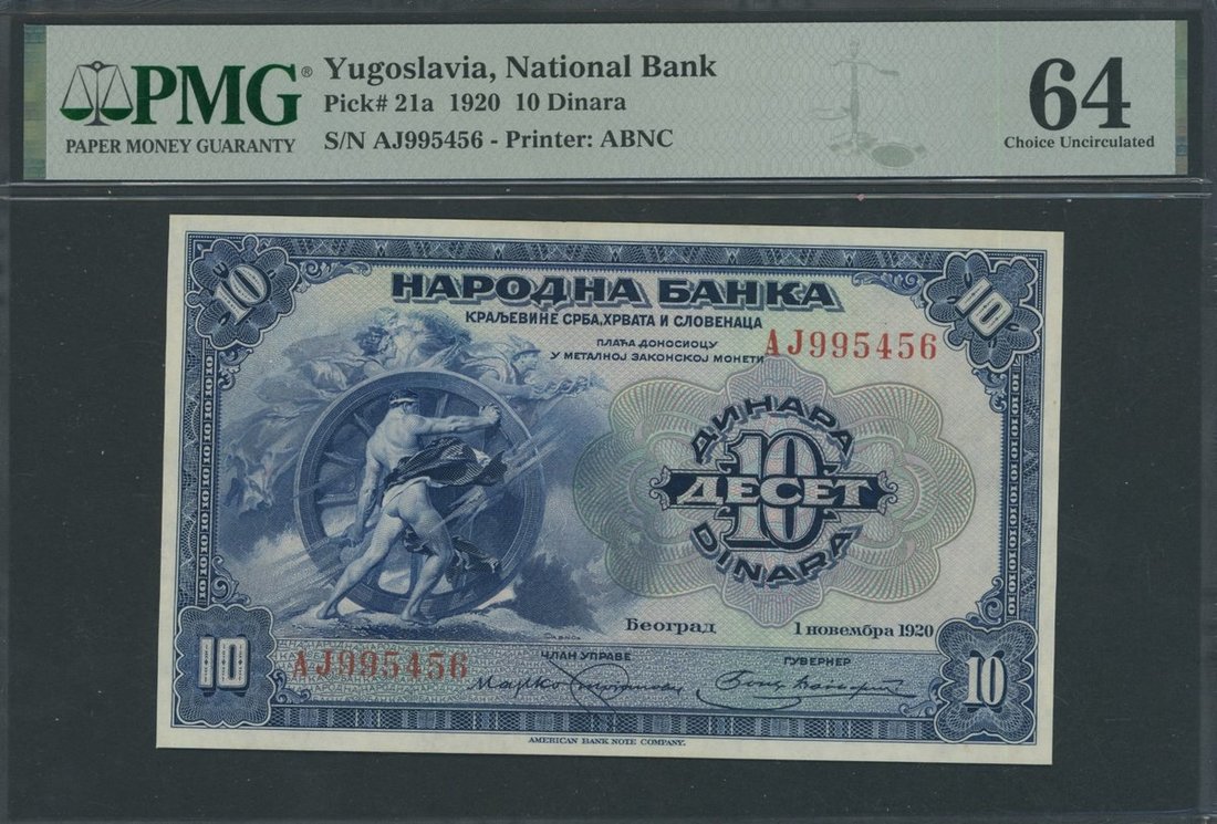 National Bank of Yugoslavia, 10 Dinara, 1st November 1920, serial number AJ995456, Printer: ABNC,