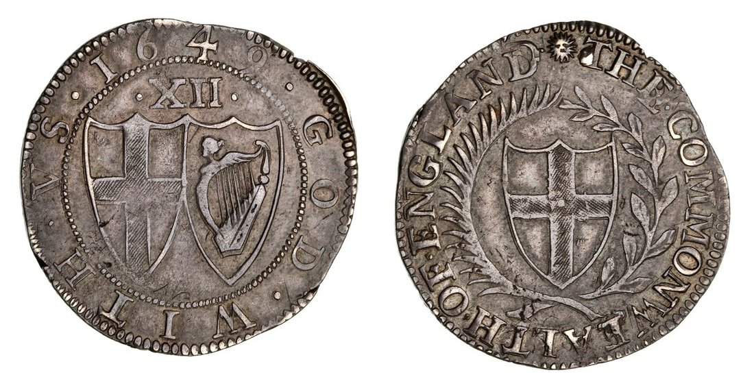 Commonwealth (1649-1660), Shilling, 1649, Tower, (m.m.) • THE • COMMONWEALTH • OF • ENGLAND •, shield of England within palm and laurel wreath, rev. 1649 • GOD • WITH • VS •, conjoined shields of England and Ireland, mark of value above, 6.02g [92.90grns], 10h, m.m. sun [on obverse only] (ESC 982; Bull 69; S.3217), metal flaw to T in THE and some doubling to obverse, small patch of graffito to reverse, darkly toned and with lustre, very fine