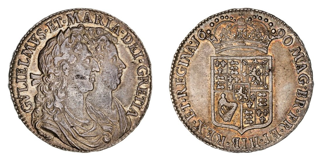 William and Mary (1688-1694), Halfcrown, 1690 SECVNDO, GRETIA Error, V over S in GVLIELMVS, first conjoined laureate and draped busts right, rev. second crowned shield, no frosting, no pearls, five strings to harp, edge lettered upwards, 15.11g, 6h (ESC 848; Bull 514 [R3]; S.3435), some flecking to portrait and soft to tops of devices, pleasing tone to reverse and some lustre, good very fine and scarce