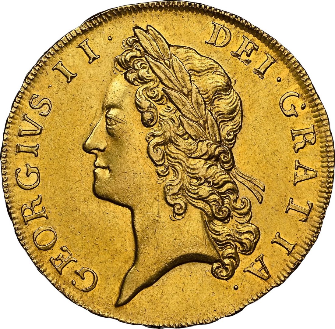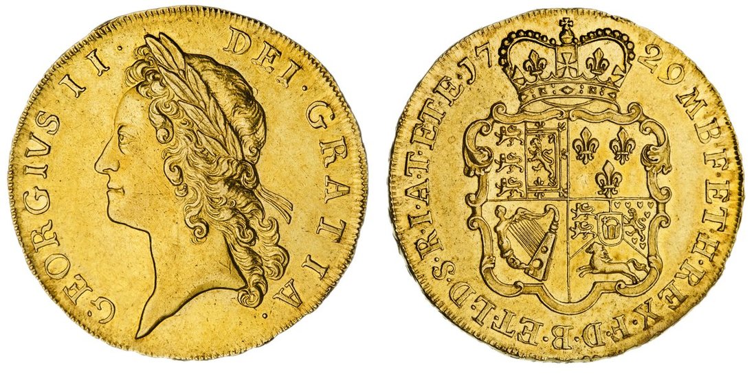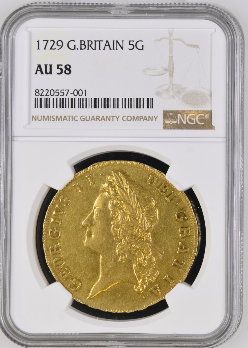 NGC AU58 | George II (1727-1760), Five-Guineas, 1729 TERTIO, younger laureate head left, plain below truncation, rev. crowned garnished shield, eleven strings to harp, edge lettering upwards, inverted Ns in ANNO, 41.84g, 6h (MCE 278; King 160; Stratos -; EGC I, 552; GH 80; S.3663), light sporadic surface marks in otherwise lustrous original fields, near extremely fine, a most presentable and pleasing specimen, in NGC holder, graded AU58 (Cert. #8220557-001)