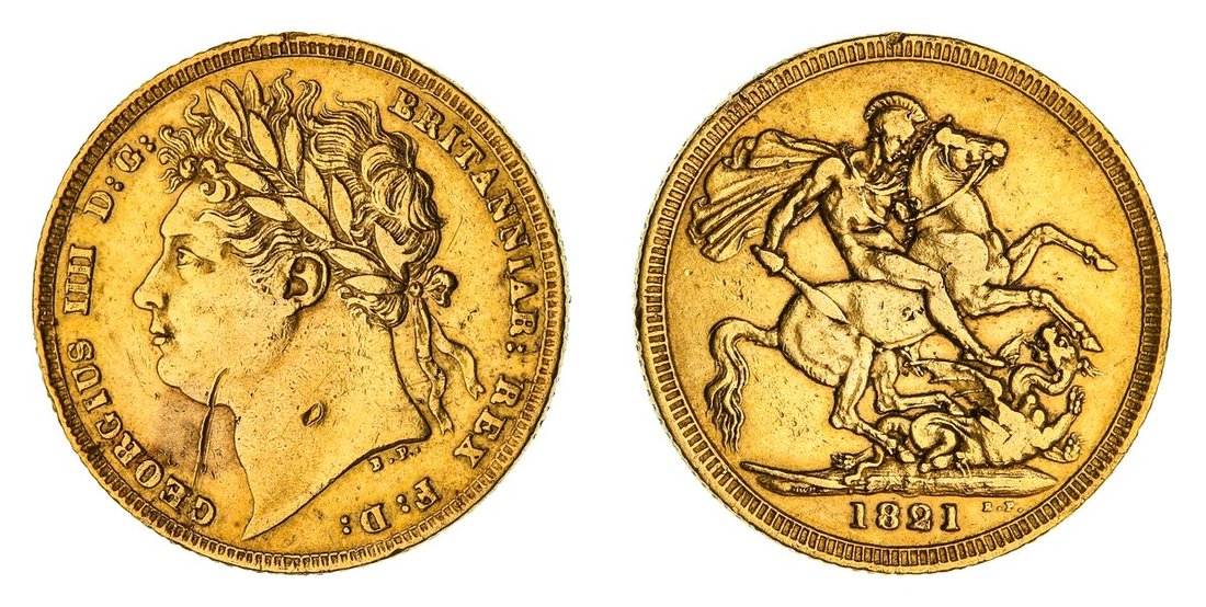 George IV (1820-1830), Sovereign, 1821, Type 1, laureate head left, rev. St. George and Dragon, edge milled, 7.94g, 6h (Marsh 5; MCE 471; EGC II, 959; Bentley 12; Stratos 119-120; S.3800), cleaned and scratched, near very fine