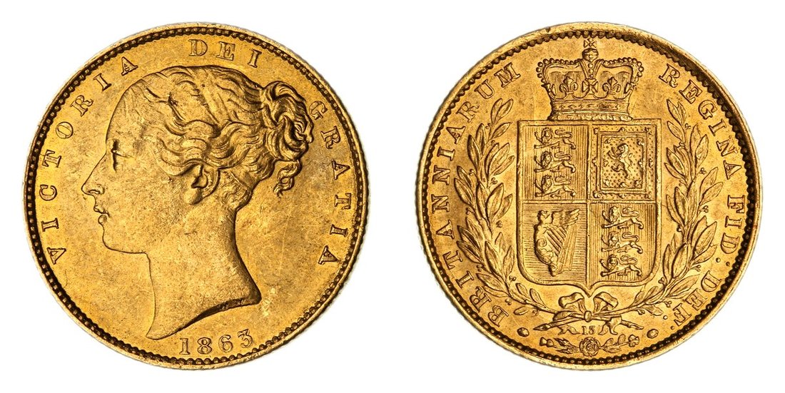 Douro Cargo | Victoria (1837-1901), Type IB, 'Shieldback' Sovereign, 1863 [Die 13], second young head left, WW incuse on truncation, rev. crowned 'normal' shield in wreath, edge milled, 7.97g, 6h (EGC II, 1162; Bentley -; MCE 524; Marsh 48; S.3853), hairline die flaw through die number, a touch of lustre, extremely fine