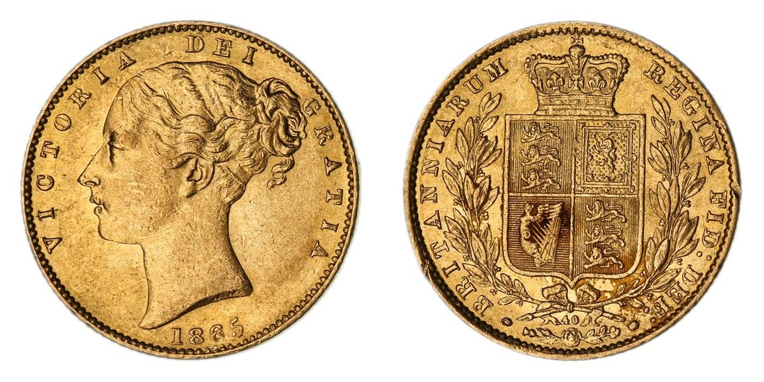 Douro Cargo | Victoria (1837-1901), Type IB, 'Shieldback' Sovereign, 1865 [Die 40], second young head left, WW incuse on truncation, rev. crowned 'normal' shield in wreath, edge milled, 7.96g, 6h (EGC II, 1164; Bentley -; MCE 526; Marsh 50; S.3853), lightly bagmarked and rusted deposits to reverse, lustre to peripheries, good very fine