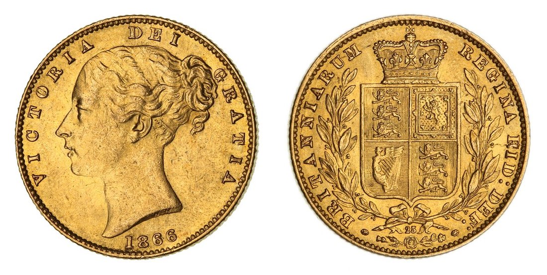 Douro Cargo | Victoria (1837-1901), Type IB, 'Shieldback' Sovereign, 1866 [Die 25], second young head left, WW incuse on truncation, rev. crowned 'normal' shield in wreath, edge milled, 7.96g, 6h (EGC II, 1165; Bentley 155; MCE 527; Marsh 51; S.3853), very lightly contact marked, lustrous, extremely fine