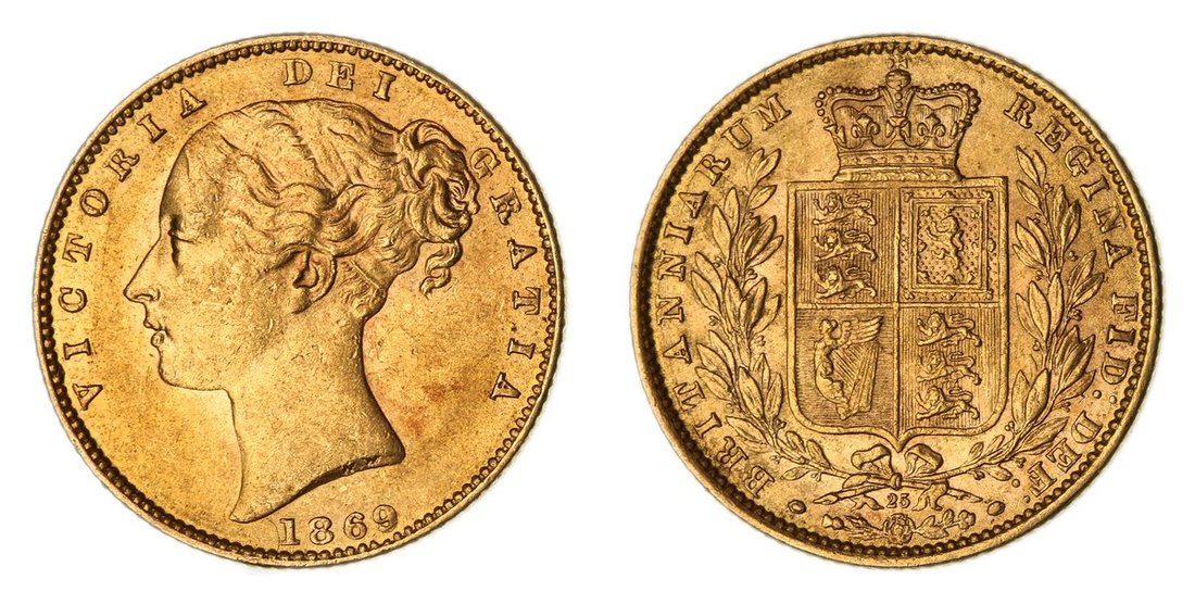 Douro Cargo | Victoria (1837-1901), Type IB, 'Shieldback' Sovereign, 1866 [Die 25], second young head left, WW incuse on truncation, rev. crowned 'normal' shield in wreath, edge milled, 7.97g, 6h (EGC II, 1165; Bentley 155; MCE 527; Marsh 51; S.3853), light bagmarking, with a patch of auburn toning, lustre in peripheries, good very fine, reverse better