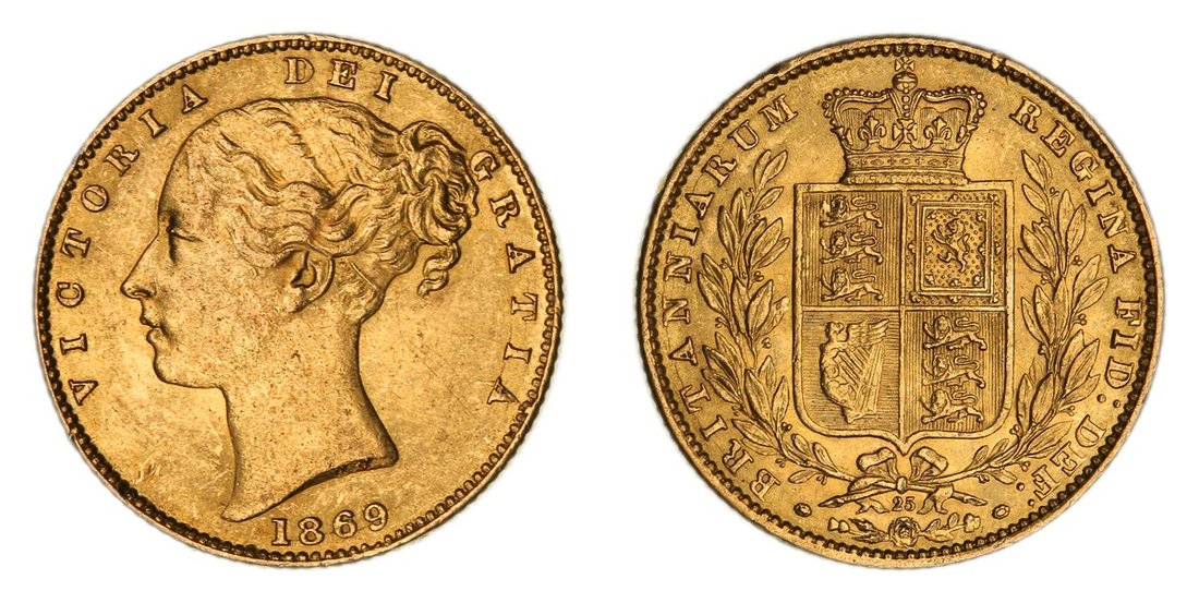 Douro Cargo | Victoria (1837-1901), Type IB, 'Shieldback' Sovereign, 1869 [Die 25], second young head left, WW incuse on truncation, rev. crowned 'normal' shield in wreath, edge milled, 7.99g, 6h (EGC II, 1168; Bentley -; MCE 529; Marsh 53; S.3853), couple of edge bruises and light marking, lustrous, about extremely fine