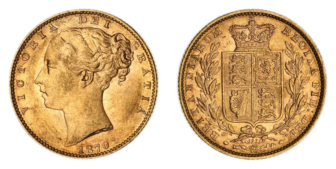 Douro Cargo | Victoria (1837-1901), 'Shieldback' Sovereign, 1870 [Die 121], third young head left, W.W. raised on truncation, rev. crowned 'normal' shield in wreath, edge milled, 7.96g, 6h (EGC II, 1170; Bentley -; MCE -; Marsh 54; S.3853B), light scattering of contact marks, otherwise with a flashy lustre, extremely fine
