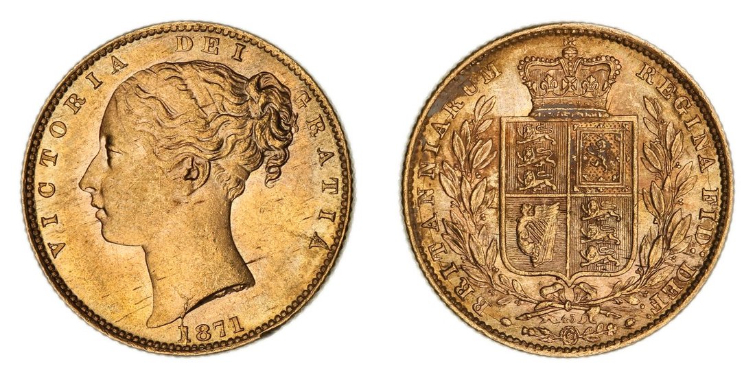 Douro Cargo | Victoria (1837-1901), 'Shieldback' Sovereign, 1871 [Die 45], third young head left, W.W. raised on truncation, rev. crowned 'normal' shield in wreath, edge milled, 7.98g, 6h (EGC II, 1171; Bentley -; MCE 531; Marsh 55; S.3853B), edge bruise and some deposits to reverse, hairline die flaws to obverse, yet with a handsome lustre, extremely fine