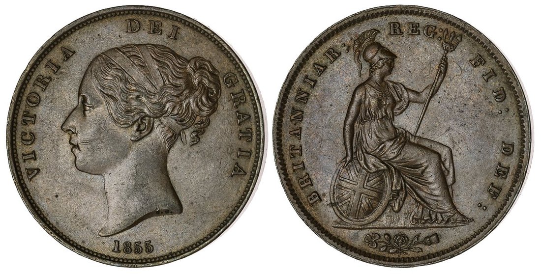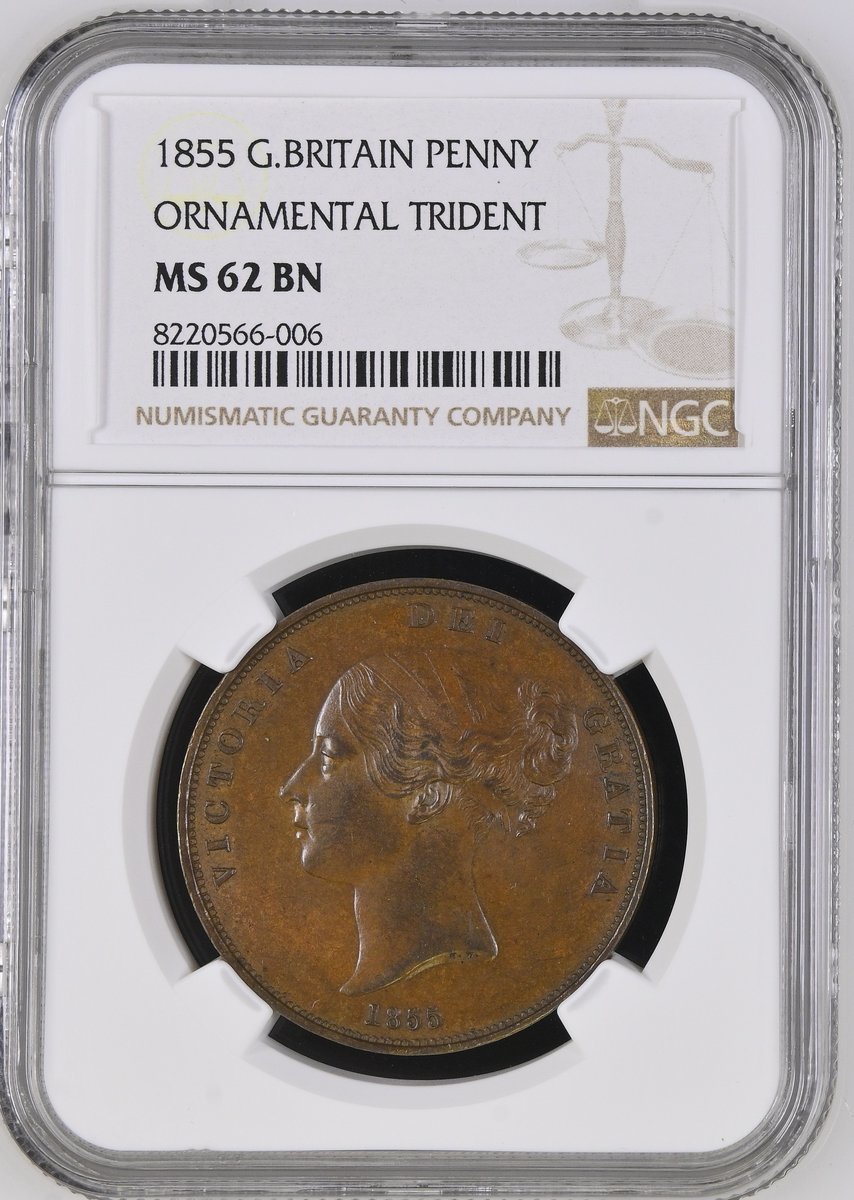 NGC MS62 BN | Victoria (1837-1901), Penny, 1855 OT, young filleted head left,