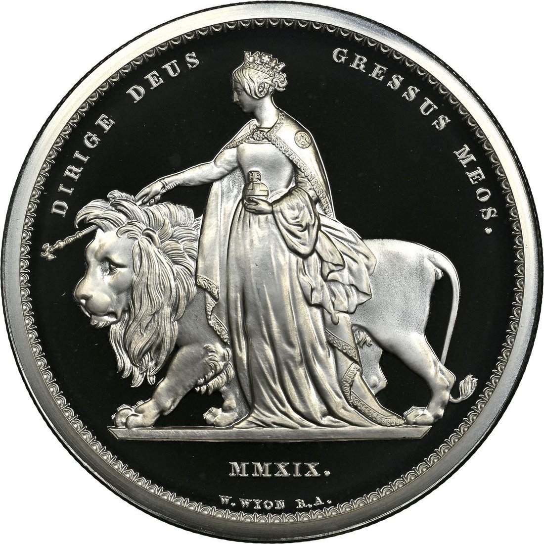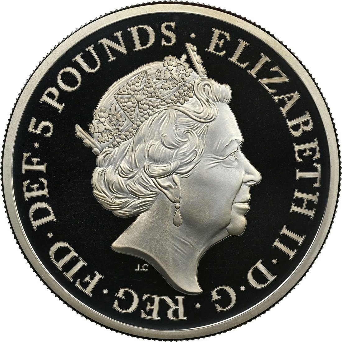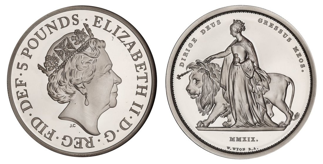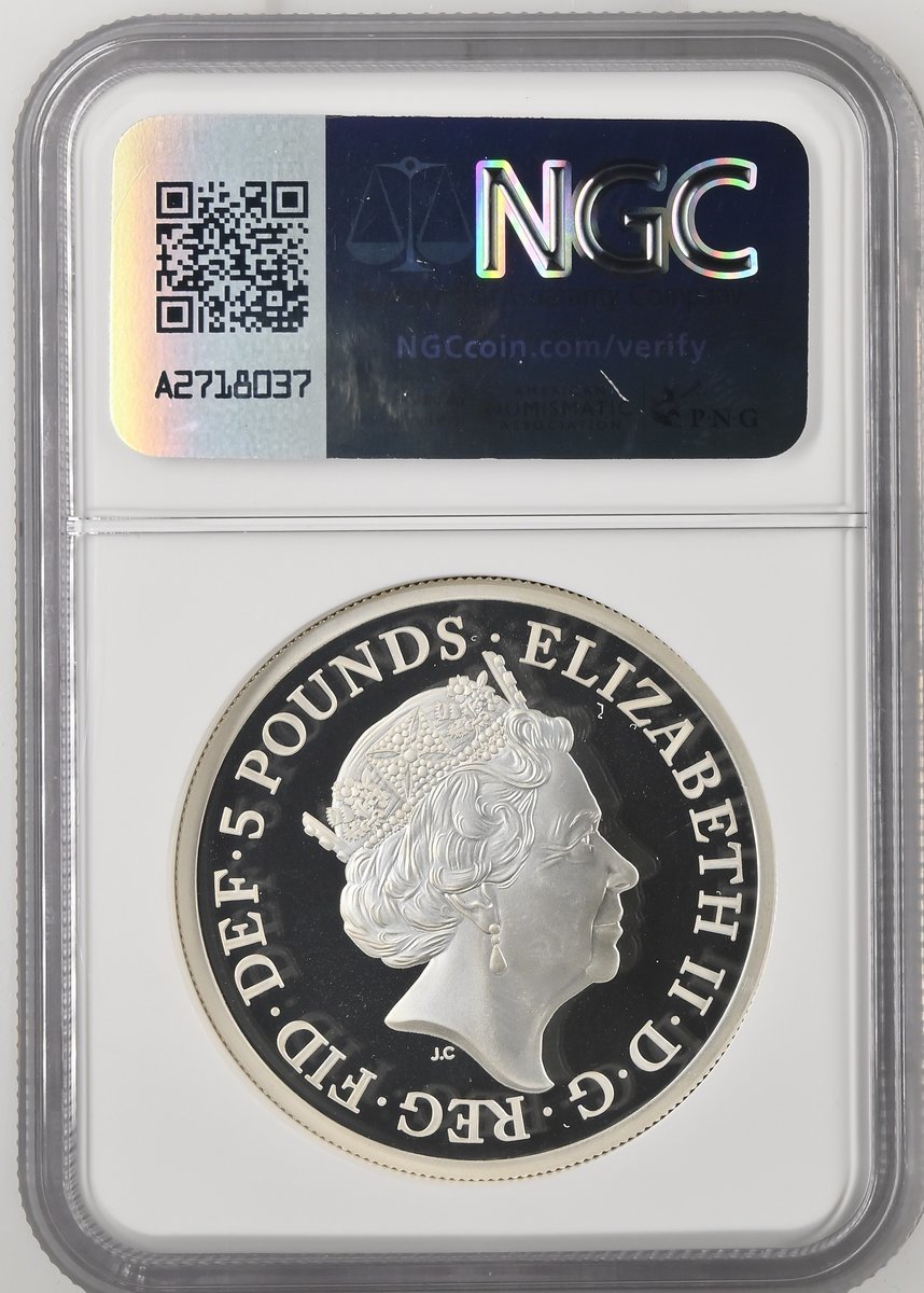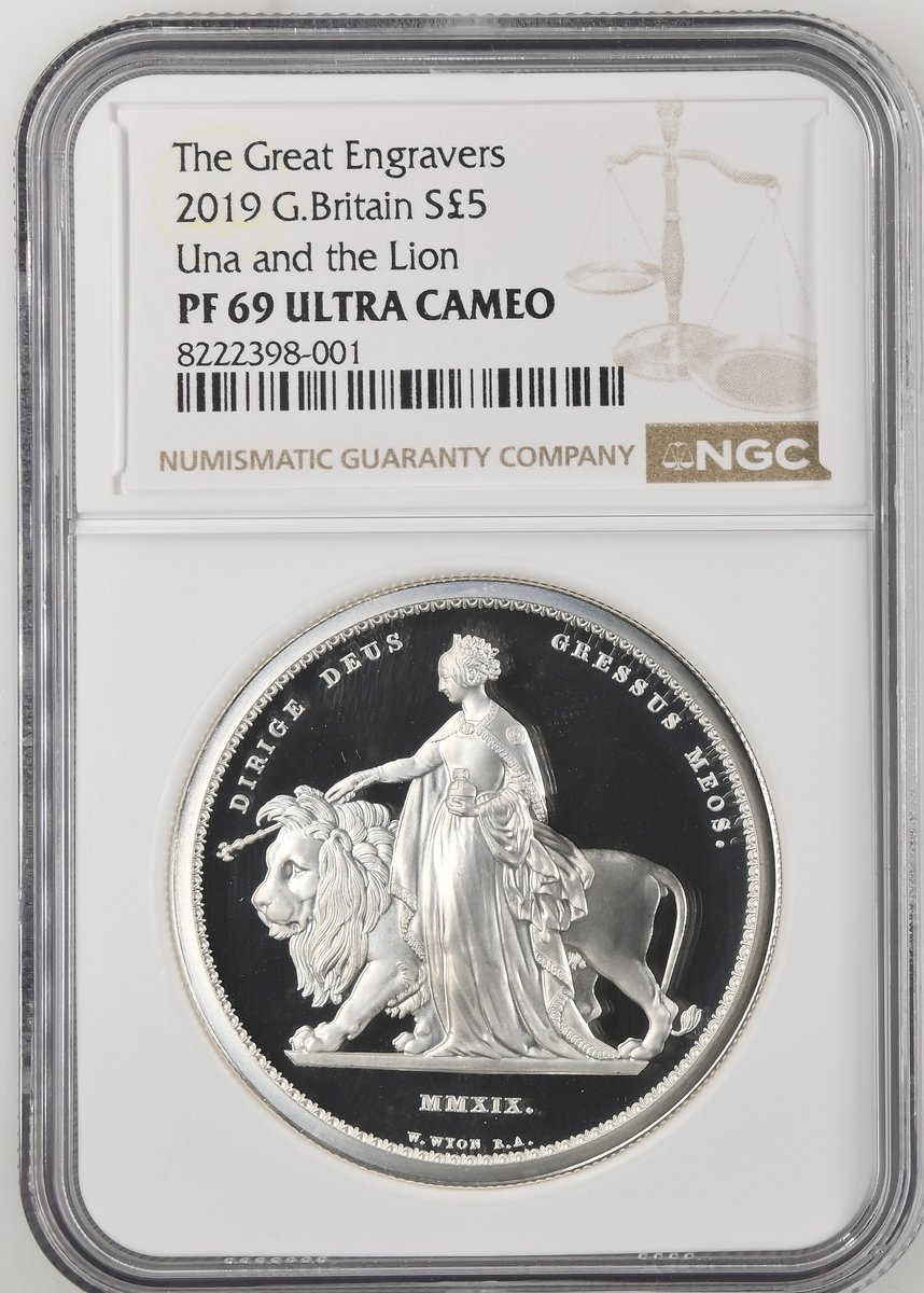 NGC PF69 UCAM | Elizabeth II (1952-2022), Commemorative "Great Engravers" Proof Silver 'Una and Lion' Five-Pounds, 2019, Llantrisant, struck in .999 Fine Silver, crowned bust right, by Jody Clark after William Wyon, rev. Una and Lion, edge milled, 62.49g, 12h (S.GE1), with a handsome cameo definition, brilliant as struck, one of only 3,002 struck and intensely sought-after in today's market place, in NGC holder, graded PF69 ULTRA CAMEO (Cert. #8222398-001)