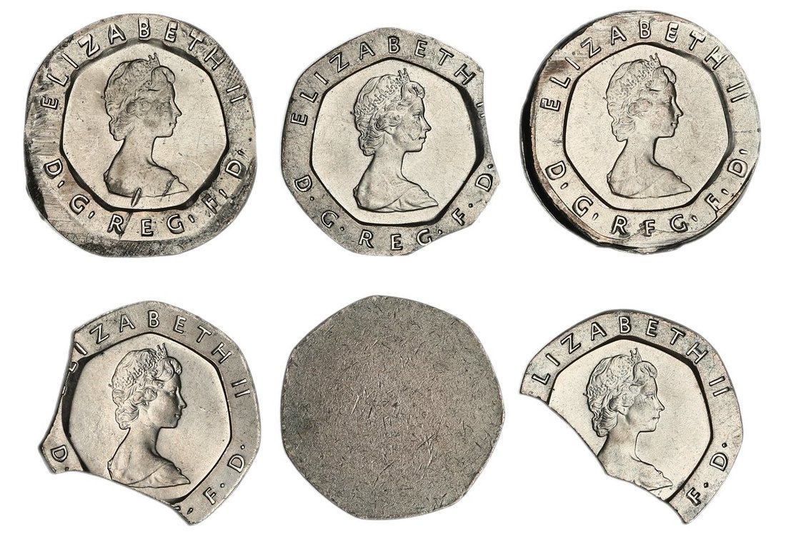 Elizabeth II (1952-2022), Mint Error Twenty-Pences, 1982 (6), ELIZABETH II D • G • REG • F • D •, crowned portrait right, by Arnold Machin, rev. TWNETY PENCE, crowned rose, edges plain, (S.G1), two example misstruck to flan, a further three struck on clipped flans and the final a fully blank planchet, all extremely fine, a fantastically interesting group of errors struck in the first year of issue of the Twenty Pence piece (6)