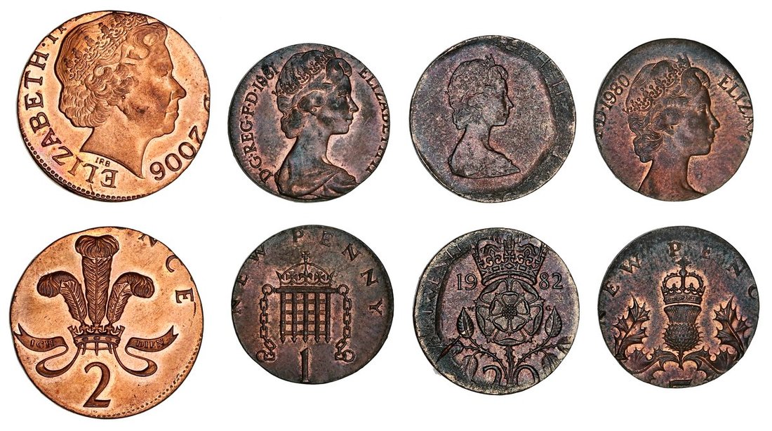 Elizabeth II (1952-2022), Misstrike Error Five-Pence, 1980, struck on a Halfpenny Planchet, 1.76g (S.D1/A1), darkly toned, with flashes of lustrous red, extremely fine; Misstrike Error Penny, 1981, struck on a Halfpenny Planchet, 1.77g (S.B1/A1), darkly toned, with flashes of lustrous red, extremely fine; Misstrike Error Twenty Pence, 1982, struck on a Halfpenny Planchet, 1.98g (S.G1/A1), richly toned, extremely fine; Misstruck Error Twopence, 2006, struck on a Penny Planchet, 3.55g (S.C5/B5), mint red, uncirculated (4)