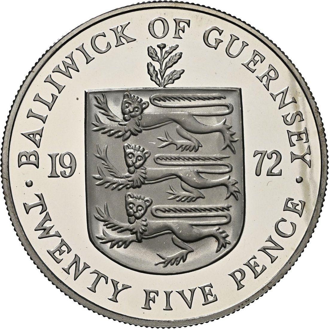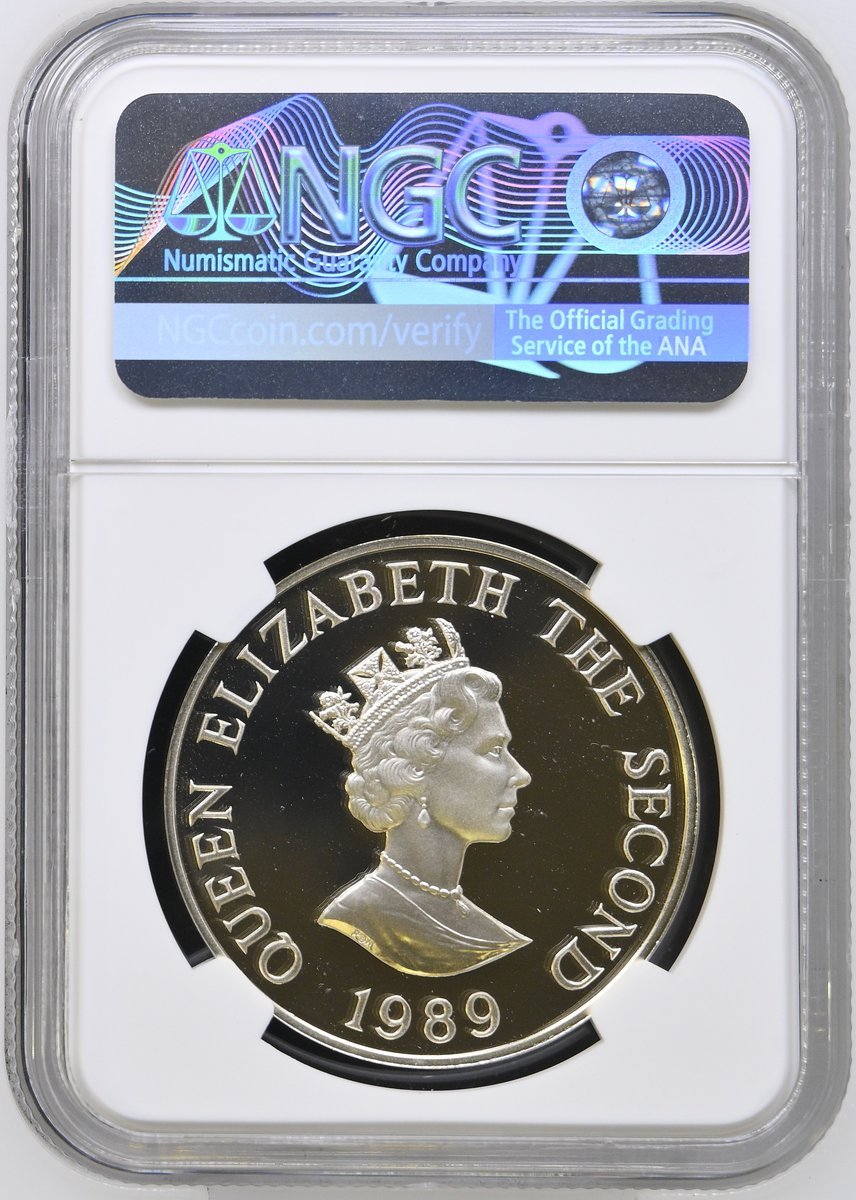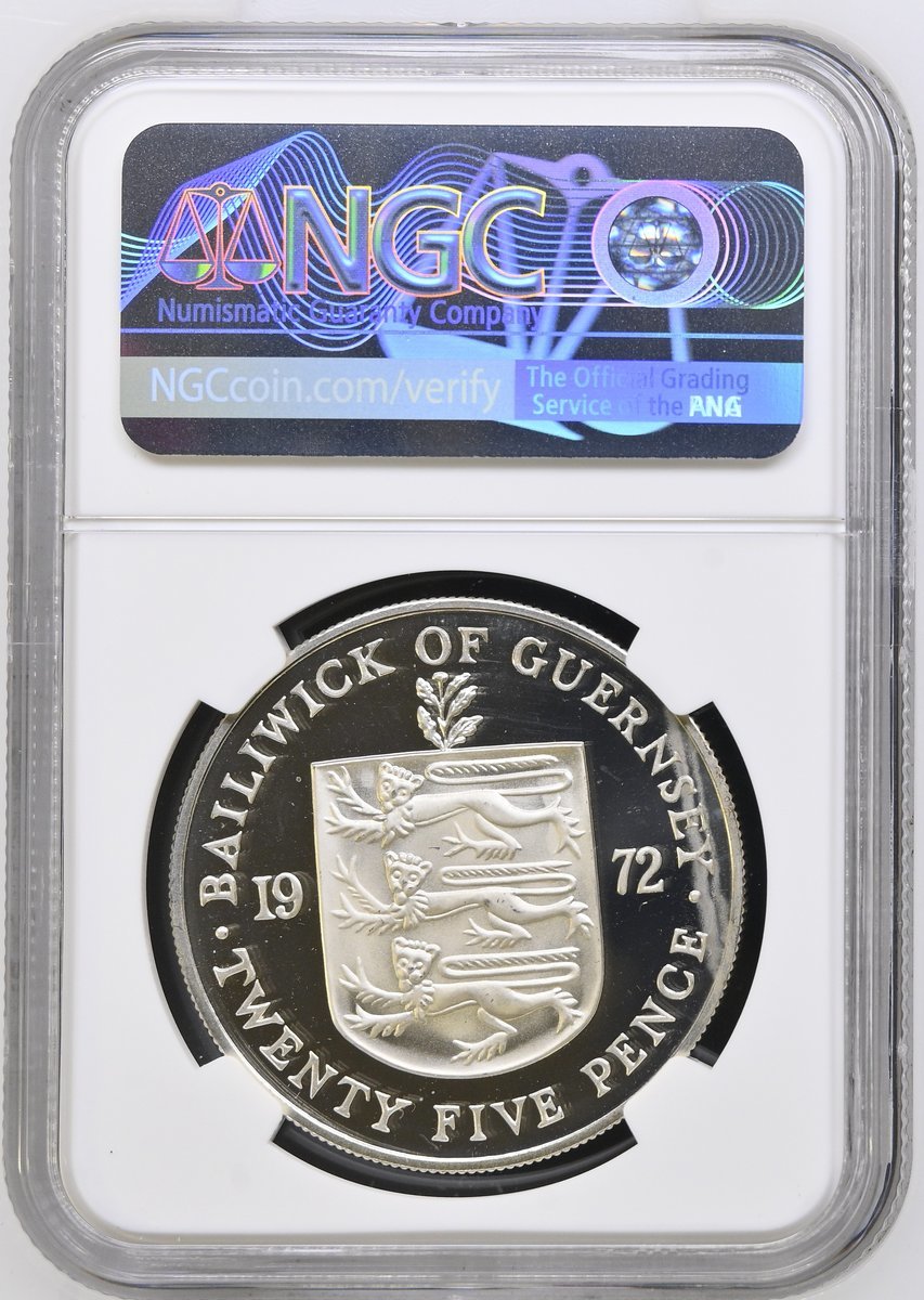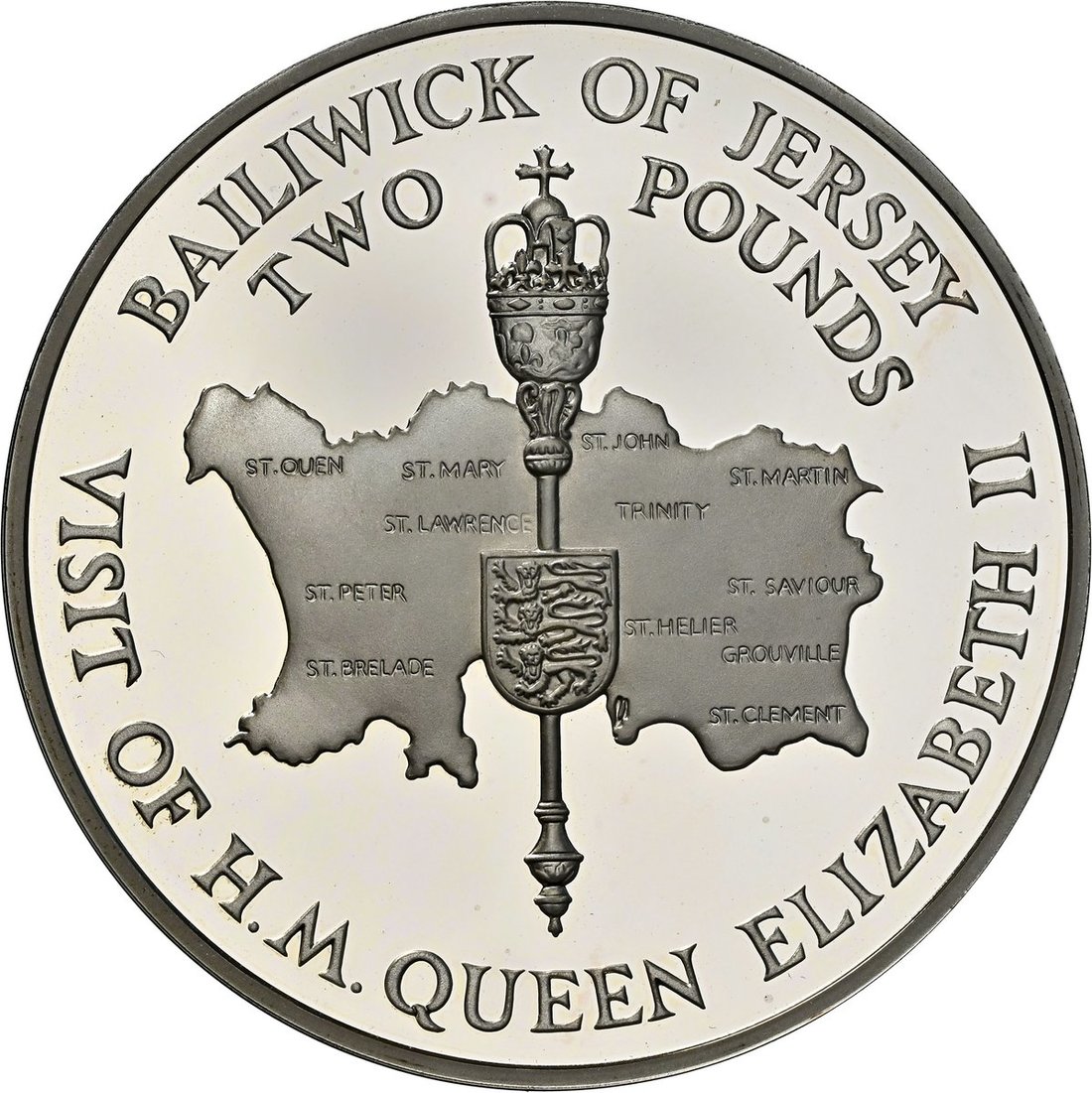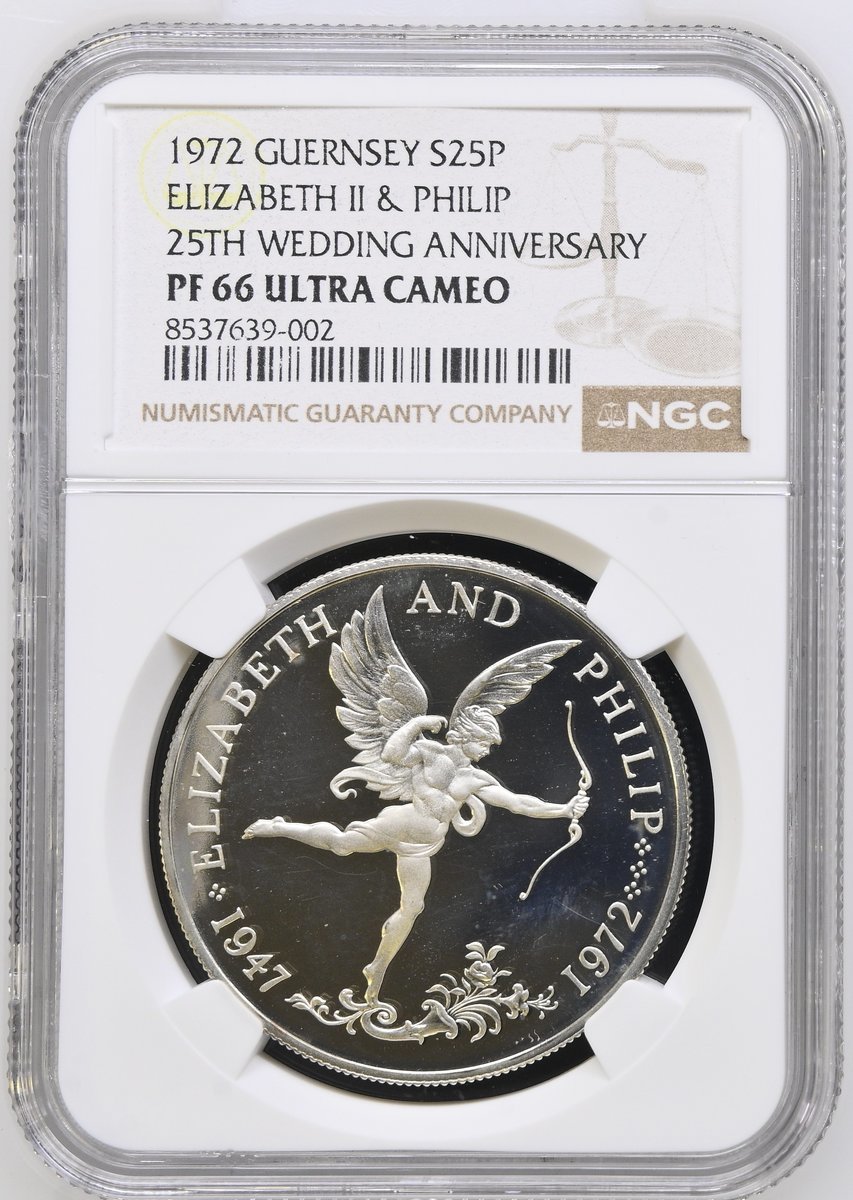 NGC PF69 UCAM | Jersey, Elizabeth II (1952-2022), Proof Silver Two-Pounds, 1989, Upon the Royal Visit to Jersey, Llantrisant, [.925 Fine], draped and crowned bust right, rev. map of the island, edge lettered, 28.28g, 12h (KM 76), brilliant uncirculated, limited run of only 3,000 struck, with Royal Mint case of Issue, in NGC holder, graded PROOF 69 ULTRA CAMEO (Cert. #8537639-001); NGC PF66 UCAM | Guernsey, Elizabeth II (1952-2022), Proof Twenty-Five Pence, 1972, Upon the Silver Wedding Anniversary of Queen Elizabeth II and Prince Philip, Llantrisant, [.925 Fine], cupid with bow right, rev. shield, edge milled, 28.28g, 12h (KM 26a), some frosting, otherwise brilliant uncirculated, in Royal Mint Case of Issue, limited run of only 15,000 struck, in NGC holder, very harshly graded PROOF 66 ULTRA CAMEO (Cert. #8537639-002) (2)