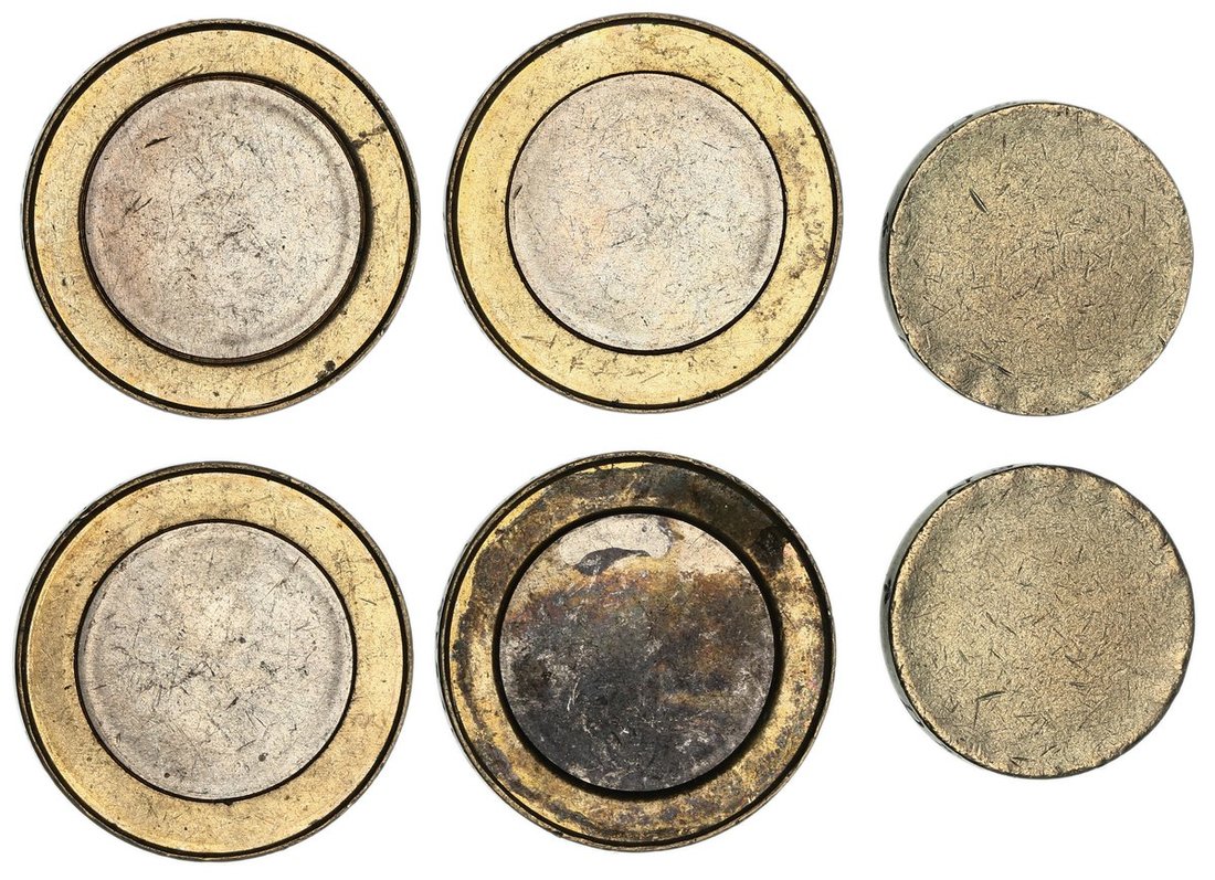 Jersey, Elizabeth II (1952-2022), Blank Planchet Error Two-Pounds (2), 1998-2012, blank to both sides, CAESAREA INSULA CAESAREA INSULA on edge, 12.02g; 12.02g (LK 102), both bagmarked and patchy toning to one, yet with lustre, very fine and scarce; Elizabeth II (1952-2022), Blank Planchet Error Pound, 1983-2016, blank to both sides, DECUS ET TUTAMEN on edge, 9.57g, bagmarked very fine (3)