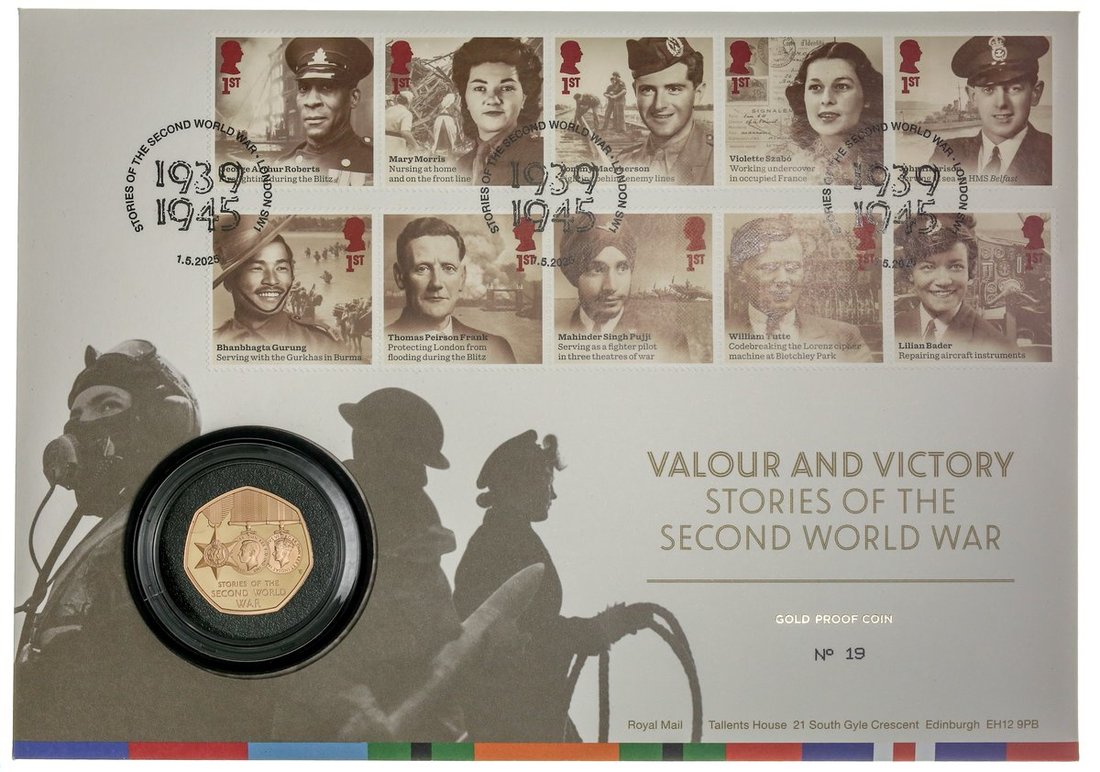 Charles III (2022-Present), Commemorative Gold Proof Fifty Pence, 2025, Upon the 80th Anniversary of the Second World War, Llantrisant, by Martin Jennings and Timothy Noad, first bare head left, rev. 1939-1945 Star, Defence and Victory Medals above with stylised and improper ribands, STORIES OF THE SECOND WORLD WAR in three lines below, edge plain, 15.50g*, 12h, brilliant uncirculated