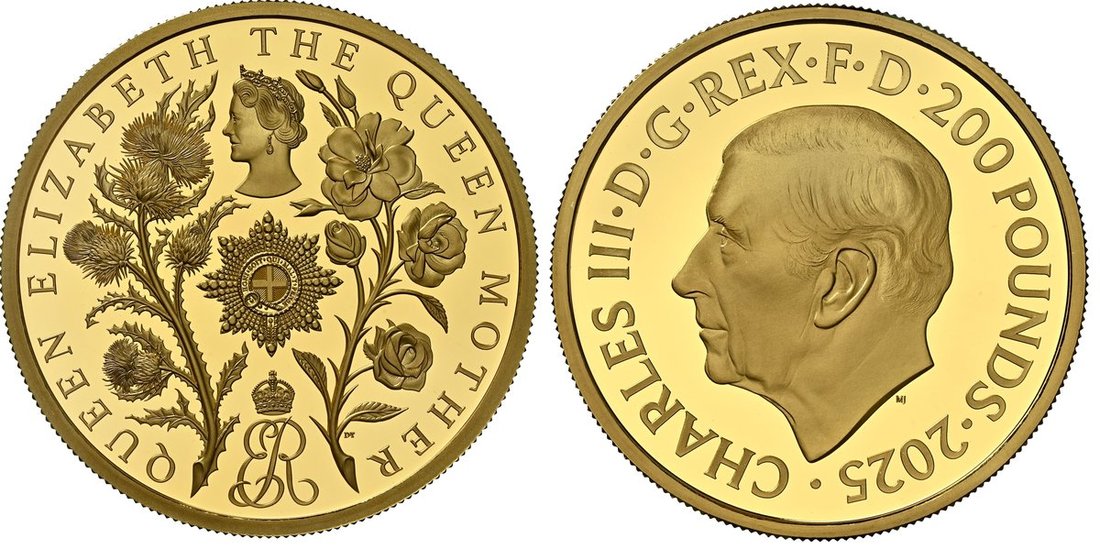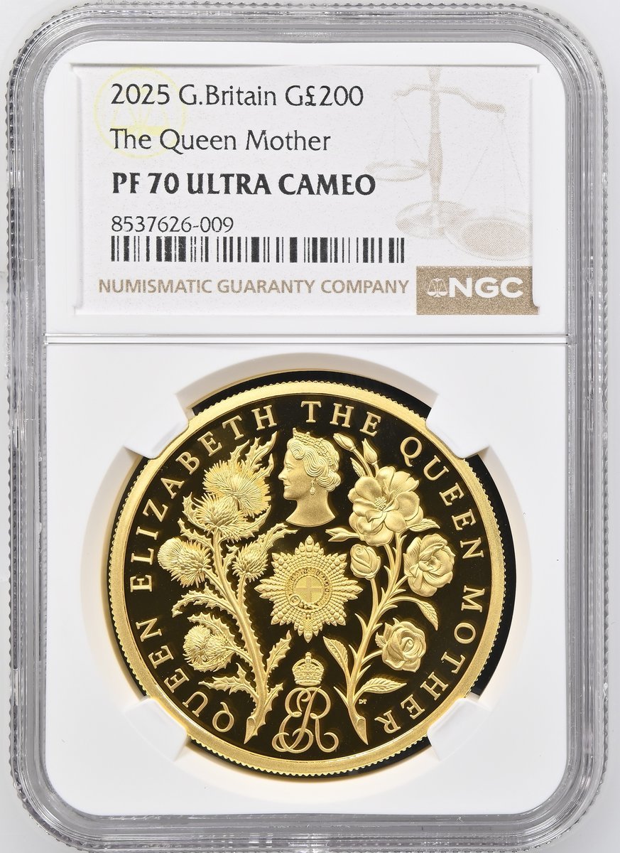 NGC PF70 UCAM | *Top Pop* | Charles III (2022-Present), Commemorative Proof 200 Pounds, 2025, Upon the 125th Anniversary of the Birth of Elizabeth Bowes-Lyon, The Queen Mother, Llantrisant, by Martin Jennings and Dan Thorne, first bare head left, rev. QUEEN ELIZABETH THE QUEEN MOTHER, Commemorative Effigy left above Garter Breast Star and crowned Cypher flanked by floral emblems, edge milled, [.999 Fine], 62.42g*, 12h, brilliant uncirculated, an extraordinarily rare modern issue with a mintage of just 46 pieces in this size, with Royal Mint Case of Issue and Certificate of Authenticity (Cert. #38), in NGC holder, graded PROOF 70 ULTRA CAMEO (Cert. #8537626-009) [*Single Finest Certified*]
