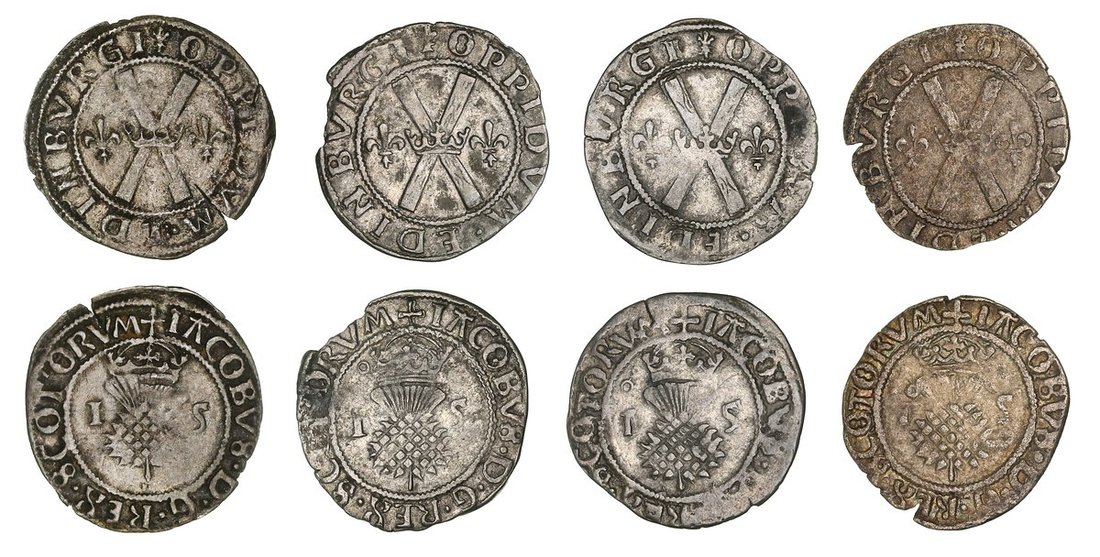 Scotland, James V (1513-1542), Third Coinage, 1538-1542, Bawbee, crowned thistle, dividing I-S, rev. crown on saltire, dividing lys, 1.42g, 8h (S.5383), striking split, very fine; and, Bawbee (3), as before, annulet over I, 1.69g, 4h; 1.52g, 4h; 1.68g, 8h (S.5384), the second with edge split, otherwise generally all about very fine or better (4)