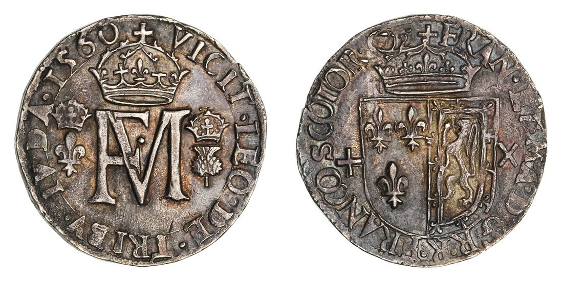 Scotland, Mary, with Francis (Second Period, 1558-1560), Testoon, 1560, FRAN • ET • MA • D • G • R • R • FRANCO SCOTOR •, crowned shield, dividing cross and saltire, rev. VICIT • LEO • DE • TRIBV • IVDA • 1560, crowned monogram, dividing crowned lys and thistle, 5.98g, 1h (S.5417), some old tooling to fields and with a subsequent dark tone, very fine
