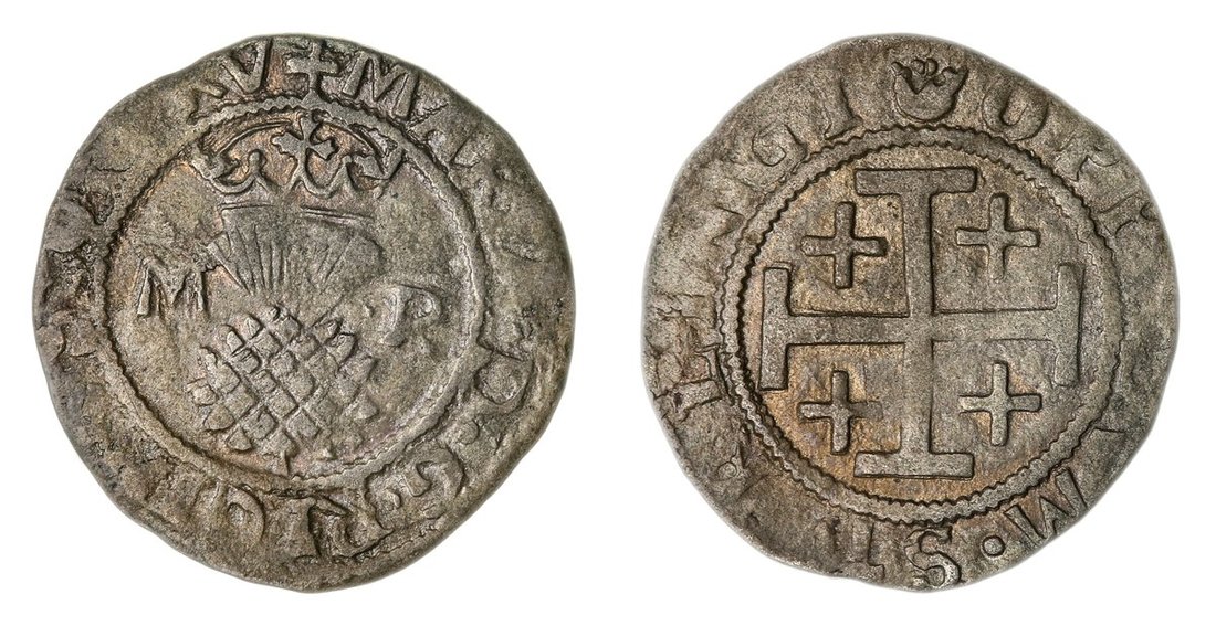 Scotland, Mary (First Period: 1542-1558), Bawbee Stirling, crowned thistle, dividing M-R, rev. cross portent, cross in each angle, 1.56g, 6h (S.5434), soft in parts, near very fine