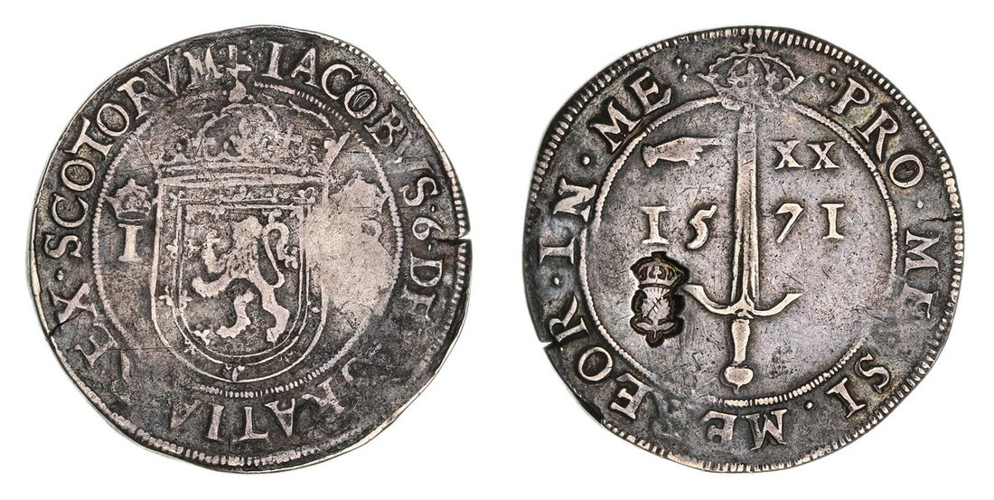 Scotland, James VI (1567-1625), First Coinage, Two-Thirds Ryal, 1571, Countermarked for Revaluation of 1578, IACOBVS . 6 . DEI . GRATIA . REX . SCOTORVM, crowned shield, dividing crowned I-R, rev. PRO . ME . SI . ME . REOR . IN . ME, sword, dividing 15-71, hand and value, thistle countermark to left of field, 19.80g, 1h (S.5474), the host coin with small striking splits, soft in parts and with contact marks, toned, bolder fine, the countermark well-struck, very fine