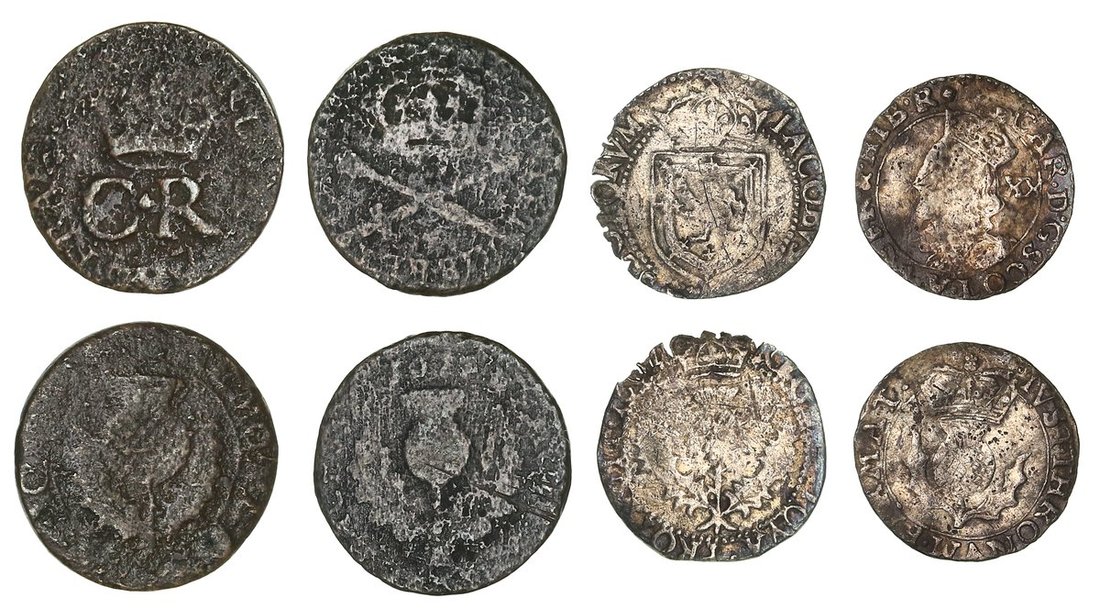 Scotland, James VI (1567-1625), Eighth Coinage, Eighth Thistle Merk, 1601, crowned shield, rev. crowned thistle, 0.69g, 4h (S.5500), chipped to edge, toned, fine; also, Eightpenny Groat, crowned shield, rev. crowned thistle, 1.50g, 7h (S.5512), metal stressing to flan, better to reverse, very fine for type; additionally, Charles I (1625-1649), Third Coinage, Twenty Pence, crowned bust left, value behind, rev. crowned thistle, 0.80g, 9h (S.5591), fair; and, Turner or Bodle, 2.45g (S.5602), good; and, Charles II (1660-1685), Turner or Bodle, 1.88g (S.5630), good (5)