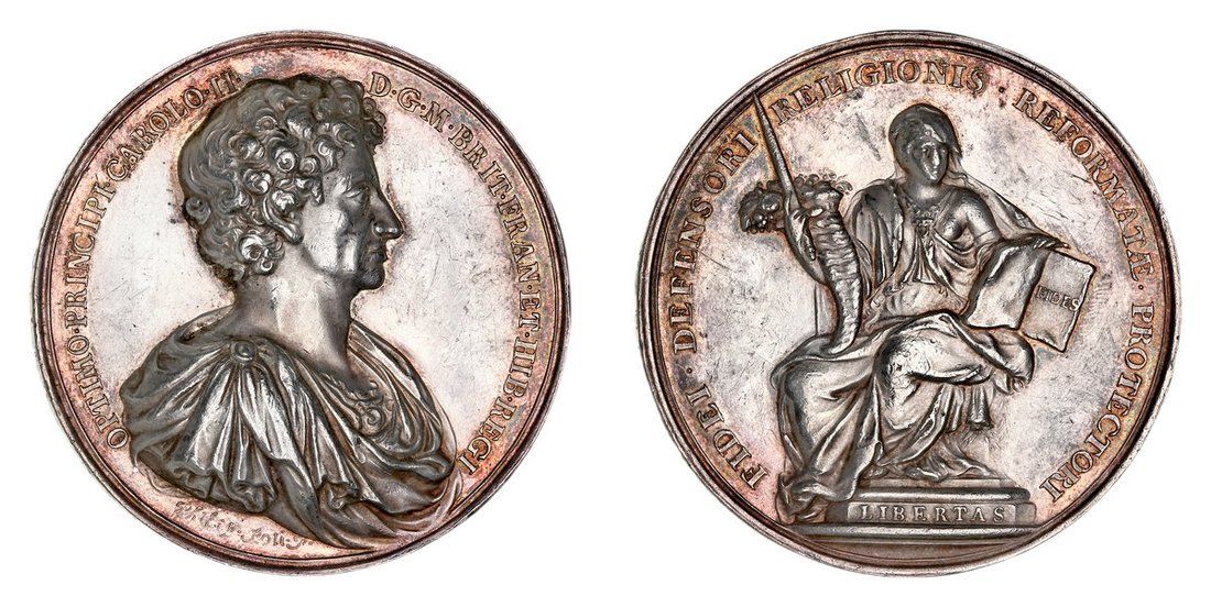 Charles II, Liberty of Conscience, AR Medal, undated (1673), by P. Roettier, OPTIMO . PRINCIPI . CAROLO . II . D . G . M . BRIT . FRAN . ET . HIB . REGI, draped and armoured bust right, rev. FIDEI . DEFENSORI RELIGIONIS . REFORMATÆ . PROTECTORI, Libertas seated, holding a book with inscription FIDES, and sword and cornucopia, ARCHITECTVRÆ NAVALIS ET MONETÆ INSTAVRATORI, upwards on edge, 59mm, 94.53g (Eimer 249; MI i 553/214), scratched and pinmarked to fields, some most minor bruising to edge, otherwise with flashy fields and a light ochre tone, really good very fine and very rare