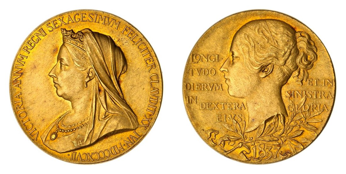 Diamond Jubilee of Victoria, Official 'Small' Gold Medal, 22 June 1897, by G. W. de Saulles after T. Brock for the Royal Mint, VICTORIA ANNVM REGNI SEXAGESIMVM FELICITER CLADVIT XX, draped and diademed bust left, rev. young head left, dividing inscription LONGITVDO SIERVM ET IN SINISTRA EIVS GLORIA, 1837 below, edge plain, 12.94g, 26mm (Eimer 1817b; BHM 3506), faintest of hairlines to fields, with a scattering of toning spots, extremely fine, in Royal Mint Case of issue