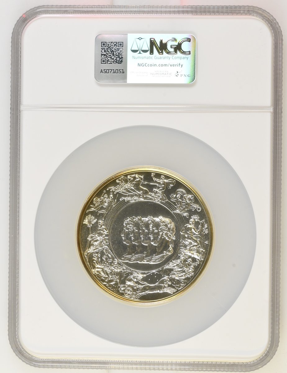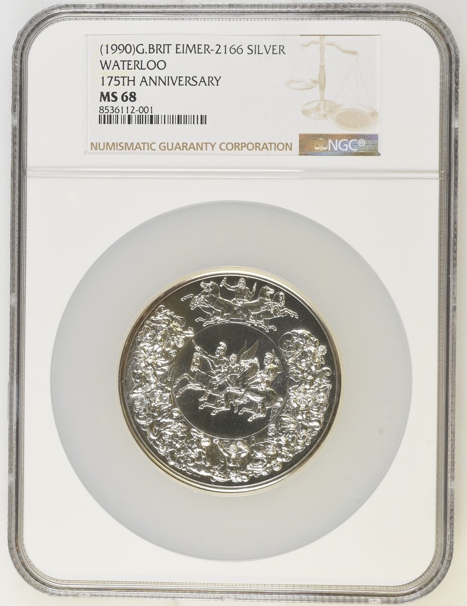 NGC MS68 | *Top Pop* | Elizabeth II (1952-2022), Battle of Waterloo 175th Anniversary, AR Medal, 1990, after B. Pistrucci, Llantrisant, [.925 Fine], conjoined, laureate and draped busts left of the Prince Regent, Francis II of Austria, Alexander I of Russia and Frederick William III of Prussia, around allegorical and mythological allusions to the Treaty of Peace which resulted from the battle of Waterloo, rev. Victory guiding Wellington and Blücher, Jupiter above, battling giants around, edge plain, 63mm, 153.26g (Eimer 2166), with toning to peripheries, otherwise as struck, limited run of only 2,500 struck, with Royal Mint Case of issue, in NGC holder, graded MS68 (Cert. #8536112-001) [*Single Finest Certified*]