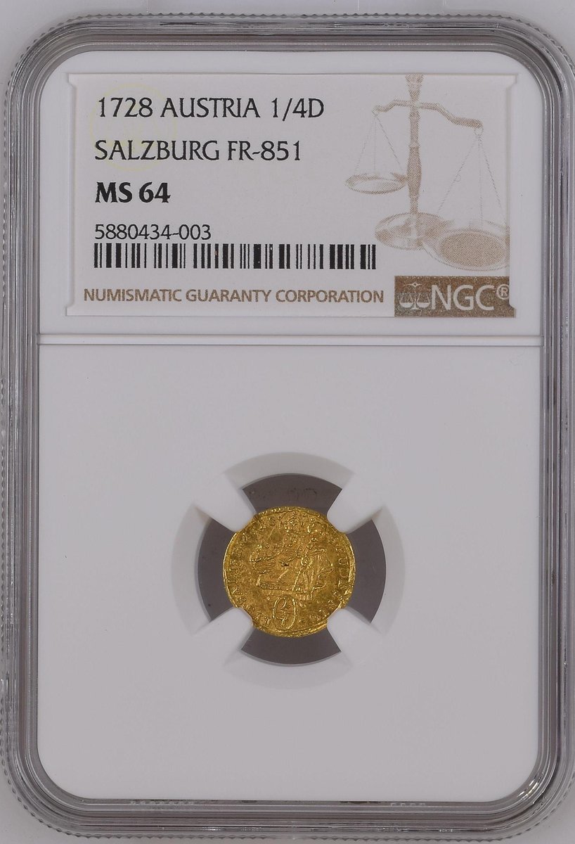 NGC MS64 | Austria, Salzburg, Leopold Anton von Firmian, (1727-1744), Gold Quarter Ducat, 1728, St. Rupert seated facing slightly left, holding salt-box and crozier, denomination in cartouche below, rev. coat of arms, archbishop's hat above, 2h (KM 330; Fr. 851; Zöttl 2562), die flaws to fields, lustrous and good very fine, in NGC holder, graded MS64 (Cert. #5880434-003)