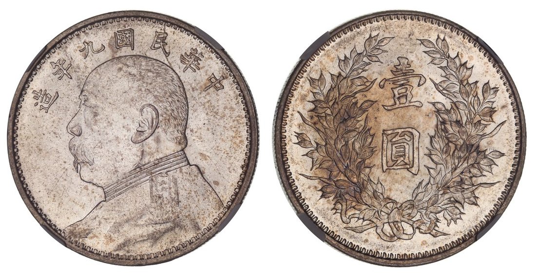 NGC AU58 | China, Republic, 'Fatman' Dollar, Year 9 (1920), draped bust left, rev. symbols within wreath, edge milled, 12h (KM Y329.6; L&M 77), couple of contact marks and with speckled toning, with a handsome cartwheel bloom, good extremely fine, in NGC holder, graded AU58 (Cert. #6459004-026)