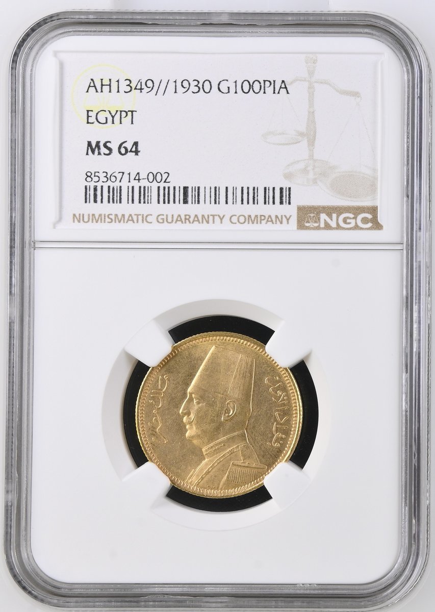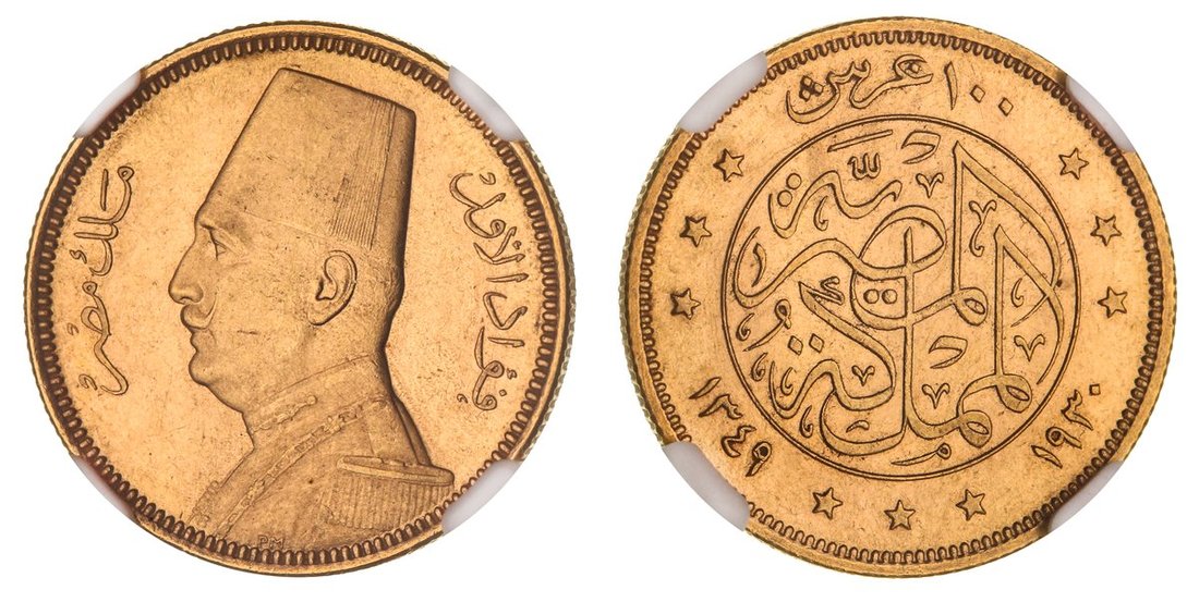 NGC MS64 | Egypt, Fu'ad (1922-1936), Gold 100 Piastres or 100 Qirsh, AH 1349 (1930), Tower (London), uniformed bust left, rev. ornamental legend, edge milled, 12h (KM 354; Fb. 32), couple of small contact marks to portrait, nonetheless with a pleasing lustre, good extremely fine, in NGC holder, graded MS64 (Cert. #8536714-002)