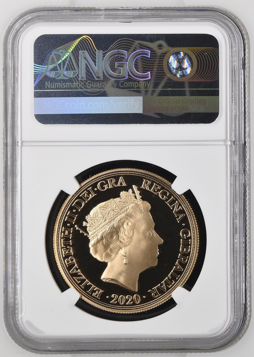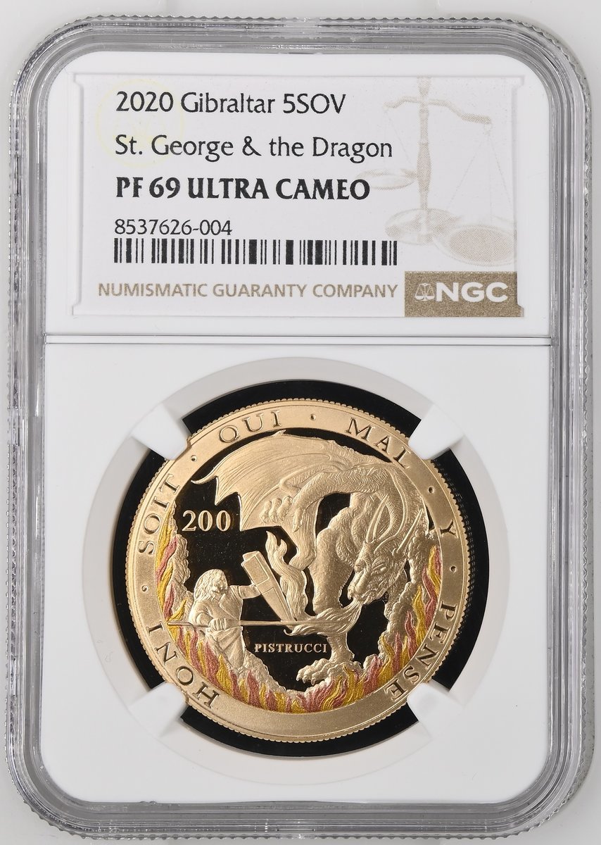 NGC PF69 UCAM | Gibraltar, Elizabeth II (1952-2022), Commemorative Gold Five-Pounds, 2020, "The Flames Edition", crowned bust right, rev. St George and Dragon, flames below, edge milled, 39.94g*, 12h, brilliant as struck, in NGC holder graded PROOF 69 ULTRA CAMEO (Cert. #8537626-004)