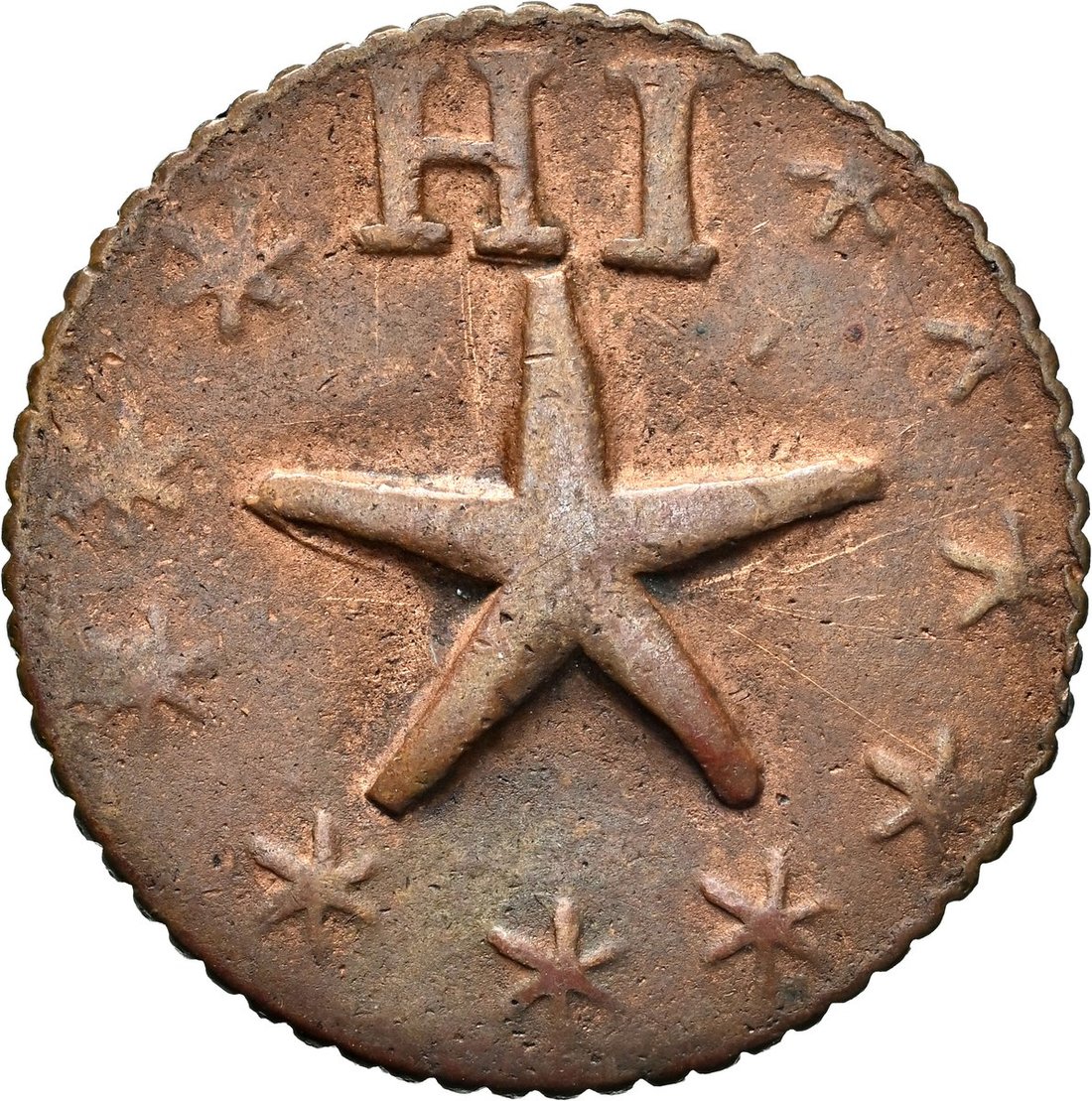 NGC AU | Hawaii, Wailuku Plantation, 6-¼ Cents, 1871, 'Narrow Starfish' Type, Philadelphia, W.P and value below, within 8 stars, rev. starfish, HI above, within 10 stars, 3.72g (Medcalf 2TE-4), with scratches and light pitting to surfaces, otherwise with pleasing flashes of red, bold very fine and scarce, in NGC holder, graded AU DETAILS ~ Scratched (Cert. #8537608-001)