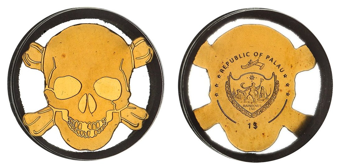 NGC MS70 | *Top Pop* | Republic of Palau, 'Golden Skull' One Dollar, 2016, issue in shape of pirate's skull-and-bones, minor freckling, virtually as struck, in NGC holder, graded MS70 (Cert. #2099792-013) [*Joint Finest Certified*]