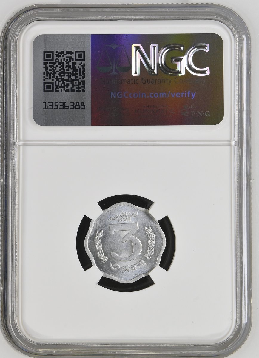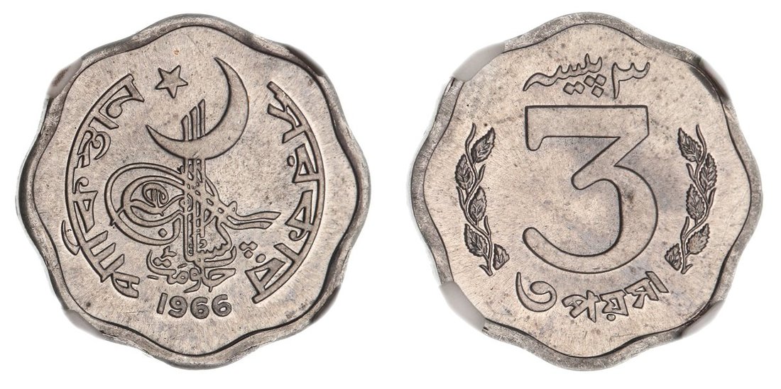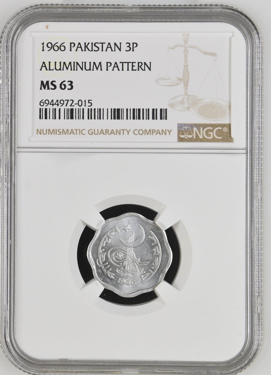 NGC MS63 | *Top Pop* | Pakistan, Pattern 3-Paisa, 1966, struck in aluminium, on scalloped flan, tughra, rev. value, 12h (KM -), couple of contact marks, otherwise with a mint bloom, uncirculated and rare, in NGC holder, graded MS63 (Cert. #6944972-015)