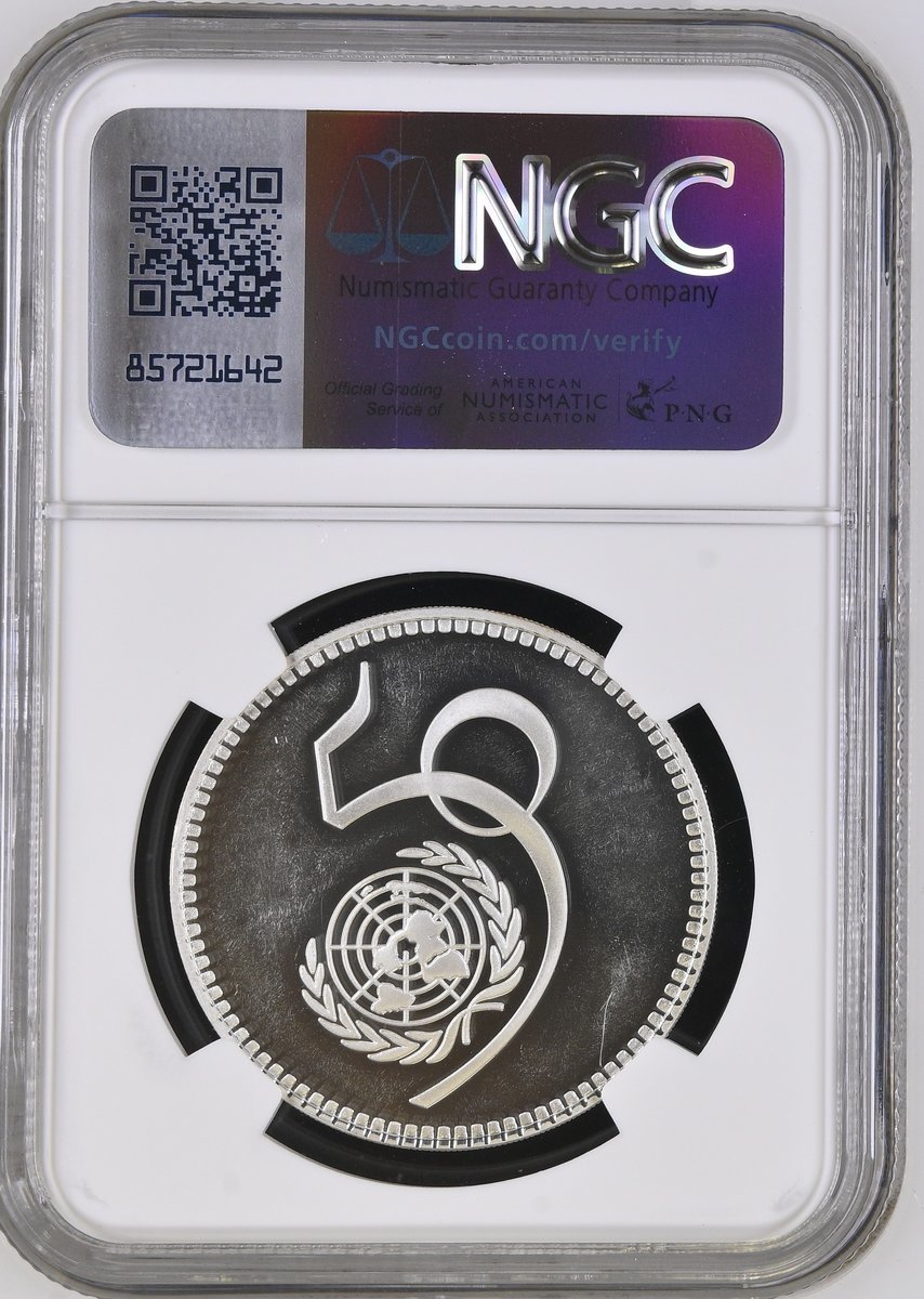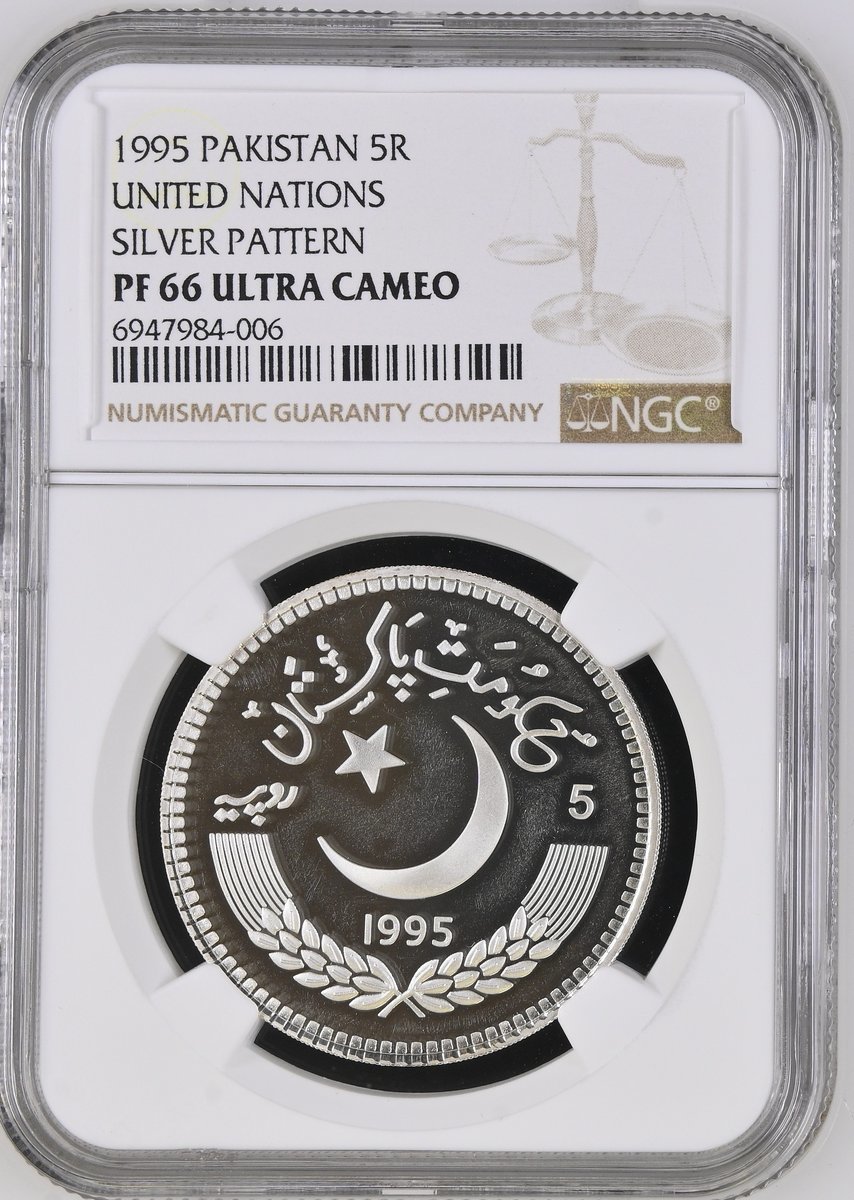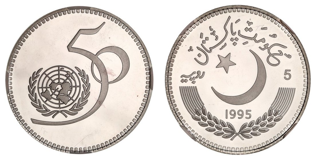 NGC PF66 UCAM | *Top Pop* | Pakistan, Proof Pattern Silver 5-Rupees, 1995, United Nations, crescent and star, rev. 50th anniversary of United Nations logo, edge milled, 10h (KM -), with a pleasing cameo definition, much as struck and rare, in NGC holder, graded PF66 ULTRA CAMEO [*Single Finest Certified*] (Cert. #6947984-006)