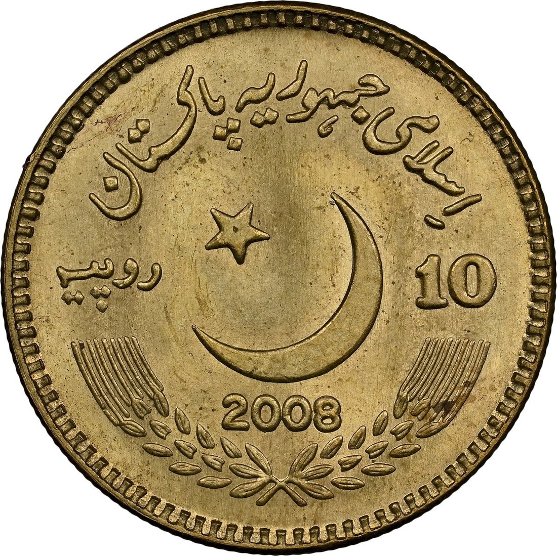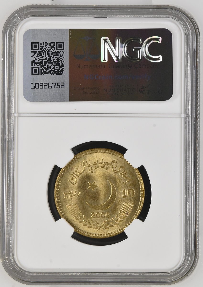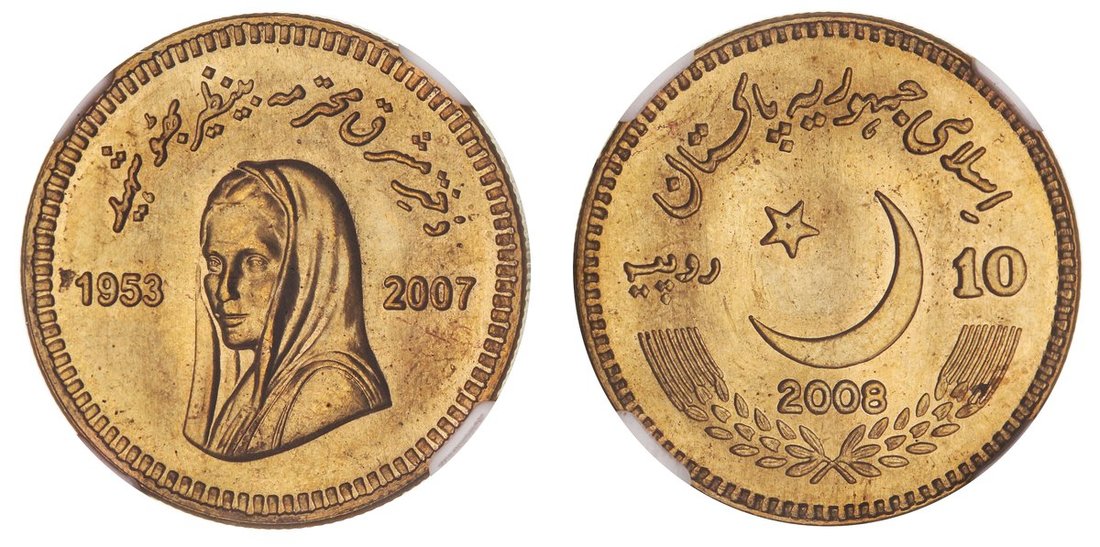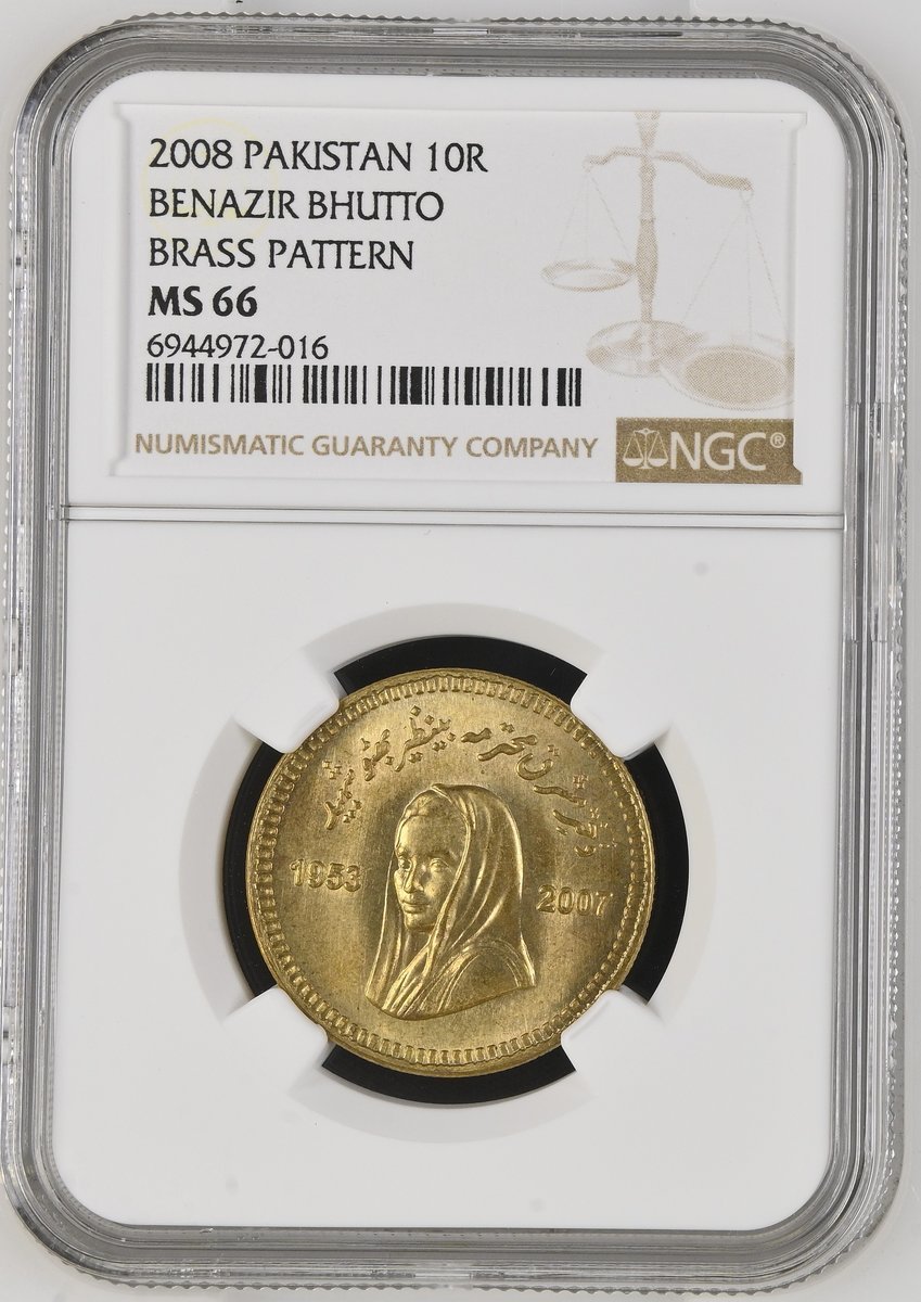 NGC MS66 | *Top Pop* | Pakistan, Brass Pattern 10-Rupees, Benazir Bhutto, struck in brass, 2008, draped bust left, rev. crescent and star, edge milled, 12h (KM -), with a pleasing mint bloom, uncirculated and rare, in NGC holder, graded MS66 [*Single Finest Certified*] (Cert. #6944972-016)