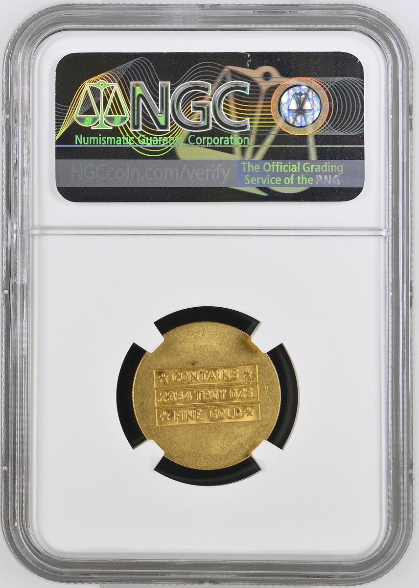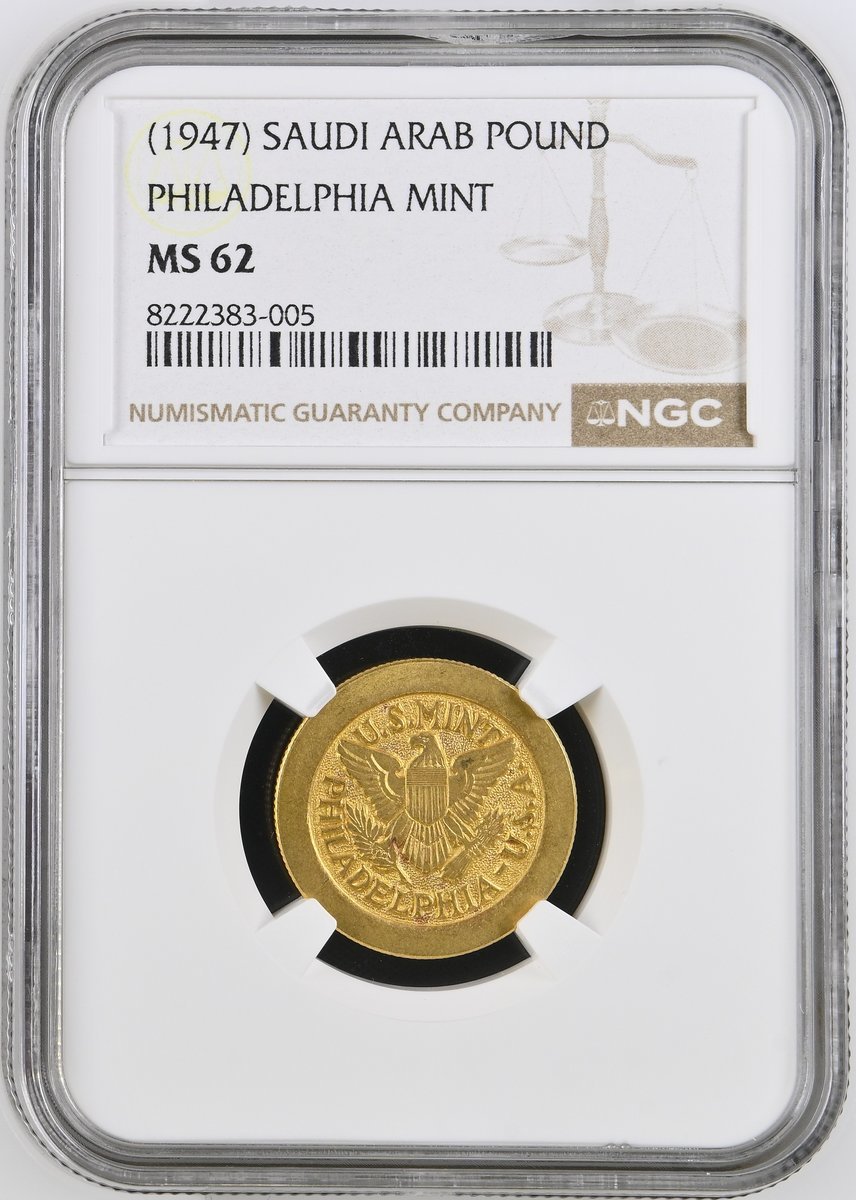 NGC MS62 | Saudi Arabia, temp. Abd al-'Aziz ibn al-Sa'ud (1926-1953), Bullion Pound, c. 1947, Philadelphia, U.S. MINT PHILADELPHIA - U.S.A. around federal eagle, rev. * CONTAINS * | .2354 TROY OZS. | * FINE GOLD *, in three lines in incuse rectangle, edge milled, 7.96g, 12h (KM 3; Fb. 191), lustrous, extremely fine, in NGC holder, graded MS62 (Cert. #8222383-005)
