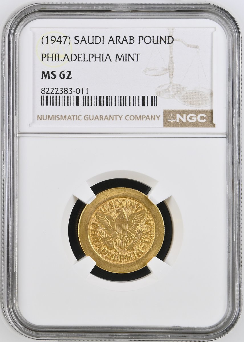 NGC MS62 | Saudi Arabia, temp. Abd al-'Aziz ibn al-Sa'ud (1926-1953), Bullion Pound, c. 1947, Philadelphia, U.S. MINT PHILADELPHIA - U.S.A. around federal eagle, rev. * CONTAINS * | .2354 TROY OZS. | * FINE GOLD *, in three lines in incuse rectangle, edge milled, 7.97g, 12h (KM 3; Fb. 191), lustrous, extremely fine, in NGC holder, graded MS62 (Cert. #8222383-011)