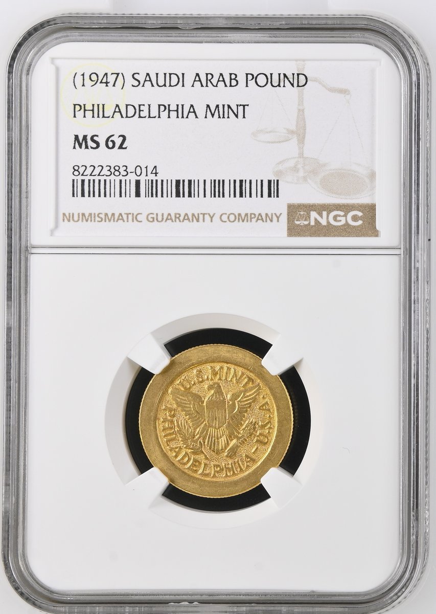 NGC MS62 | Saudi Arabia, temp. Abd al-'Aziz ibn al-Sa'ud (1926-1953), Bullion Pound, c. 1947, Philadelphia, U.S. MINT PHILADELPHIA - U.S.A. around federal eagle, rev. * CONTAINS * | .2354 TROY OZS. | * FINE GOLD *, in three lines in incuse rectangle, edge milled, 7.97g, 12h (KM 3; Fb. 191), lustrous, extremely fine, in NGC holder, graded MS62 (Cert. #8222383-014)