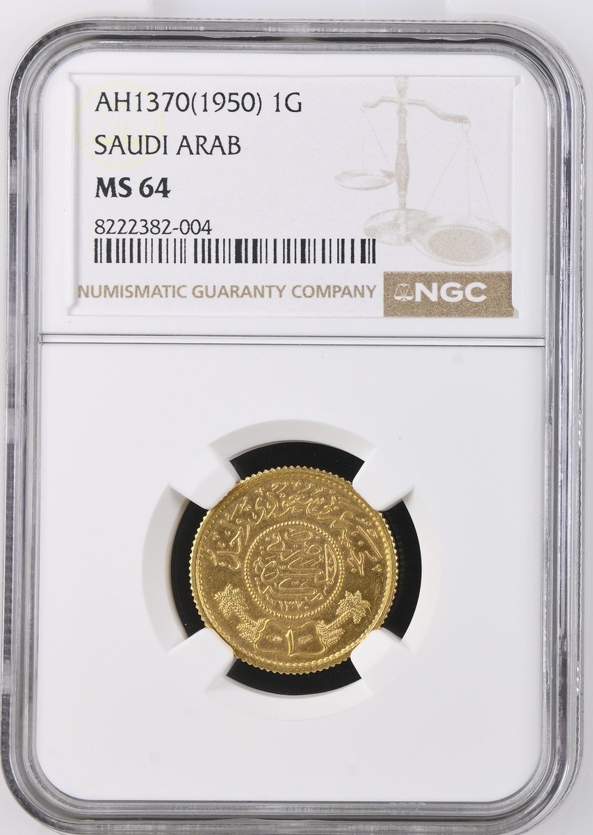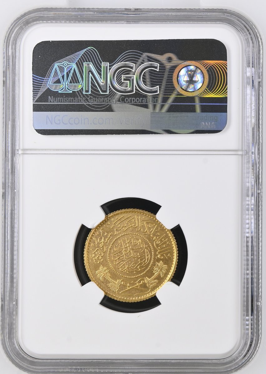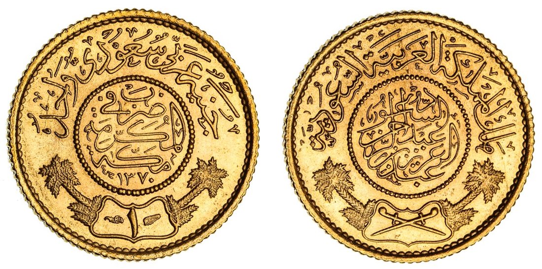 NGC MS64 | Saudi Arabia, 'Abd al'-'Aziz al-Sa'ud (1926-1953), Trade Guinea, AH1370 (1951), edge milled, 7.97g, 12h (Fb. 1; KM 36), near brilliant, much as struck, in NGC holder, graded MS64 (Cert. #8222382-004)