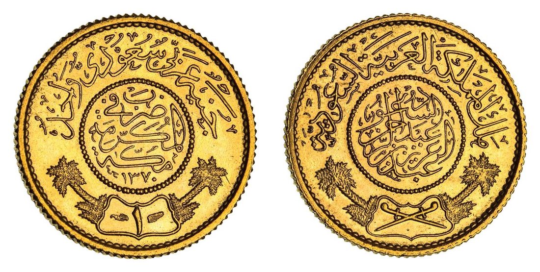 NGC MS66 | Saudi Arabia, 'Abd al'-'Aziz al-Sa'ud (1926-1953), Trade Guinea, AH1370 (1951), edge milled, 7.99g, 12h (Fb. 1; KM 36), near brilliant, much as struck, in NGC holder, graded MS66 (Cert. #8222382-005)