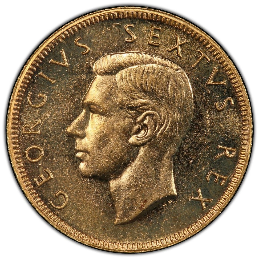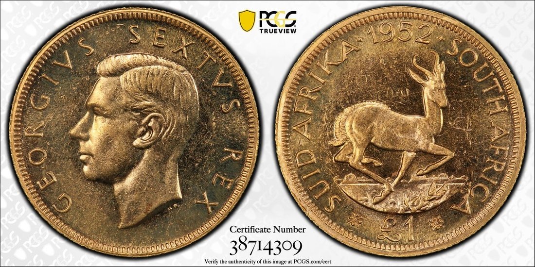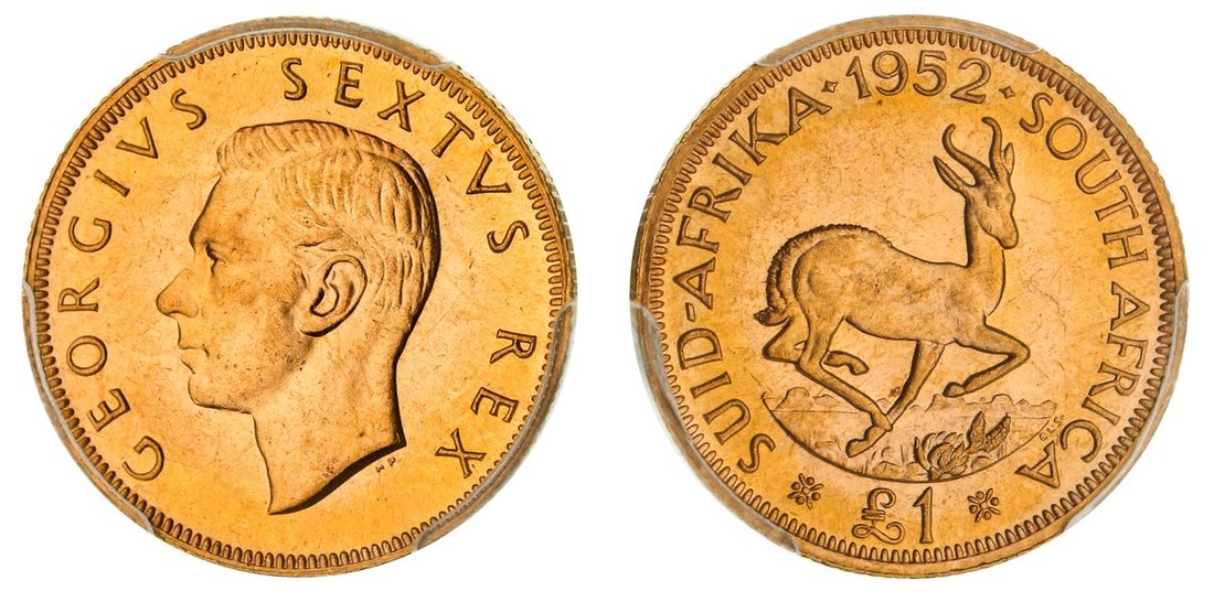 PCGS PR62 | South Africa, George VI (1936-1952), Proof Pound, 1952, bare head left, rev. springbok right, edge milled, 12h (KM 43; Hern S348), light scattering of pinmarks across surfaces, otherwise with brilliance, extremely fine, in PCGS holder, graded PR62 (Cert. #38714309)