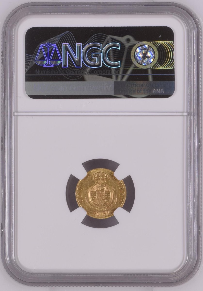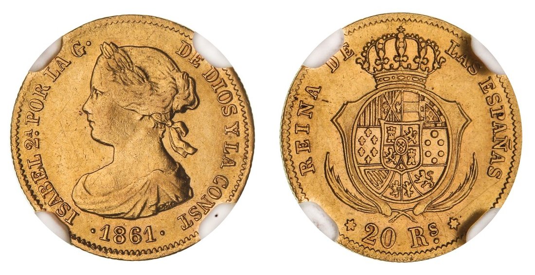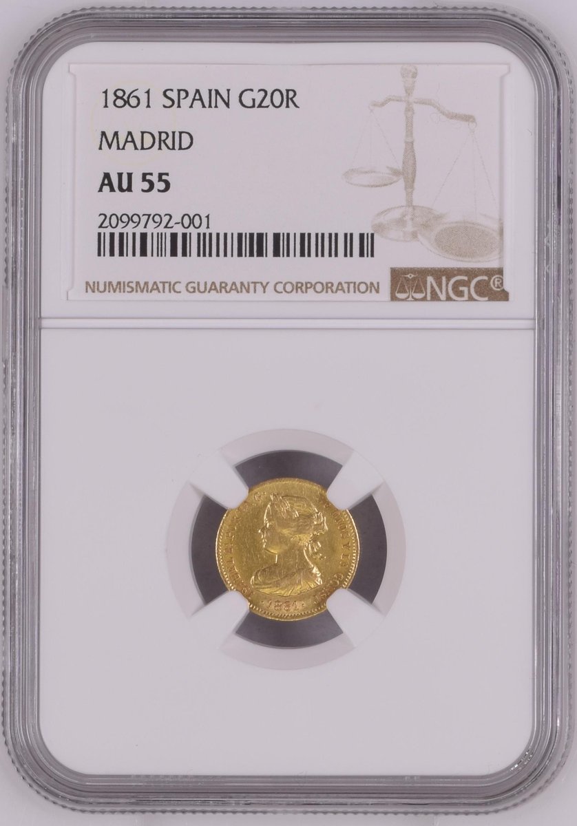 NGC AU55 | Spain, Isabel II (1833-68), Gold 20 Reales, 1861, Madrid, laureate and draped bust left, rev. crowned coat of arms of Spain, 12h (KM 610; Calicó 119), scuff to reverse, otherwise very fine, in NGC holder, graded AU55 (Cert. #2099792-001)