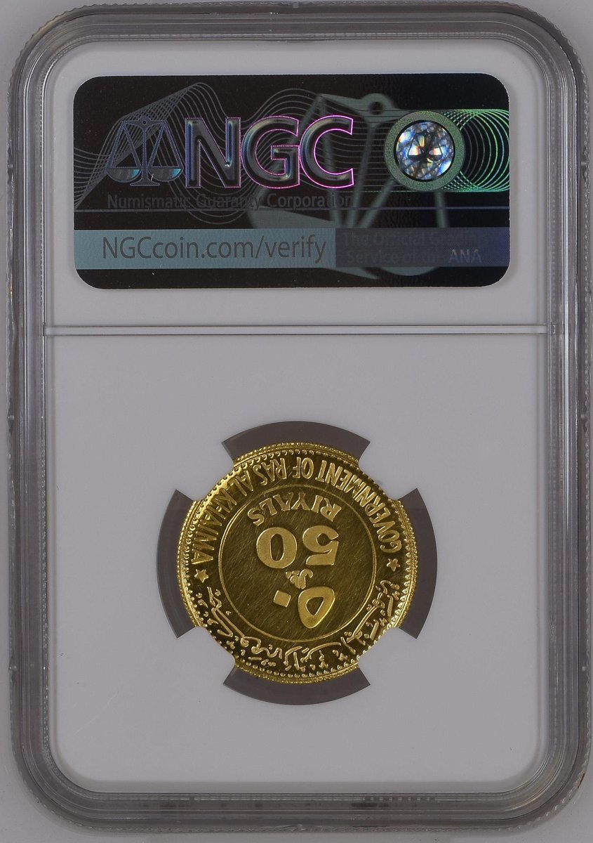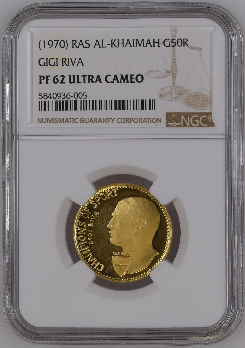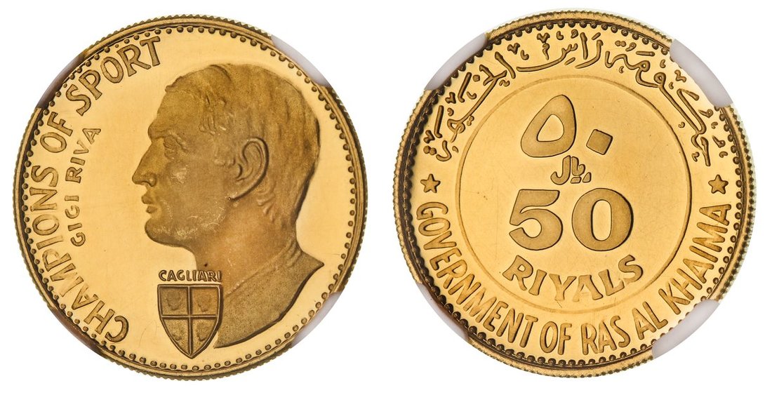 NGC PF62 ULTRA CAMEO | United Arab Emirates, Ras Al Khaimah, Saqr bin Mohammed al-Qassimi (1948-2010), gold Proof 50-Riyals, Gigi Riva, 1970, edge milled, 6h (KM 10; Fb. 9), hairlined and small pinmark to reverse, otherwise with a pleasing cameo definition, extremely fine, in NGC holder, graded PF62 ULTRA CAMEO (Cert. #5840936-005)