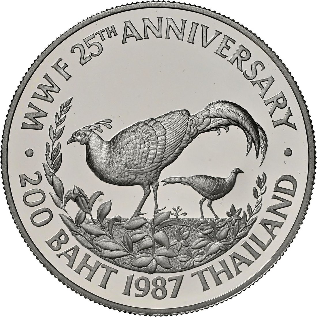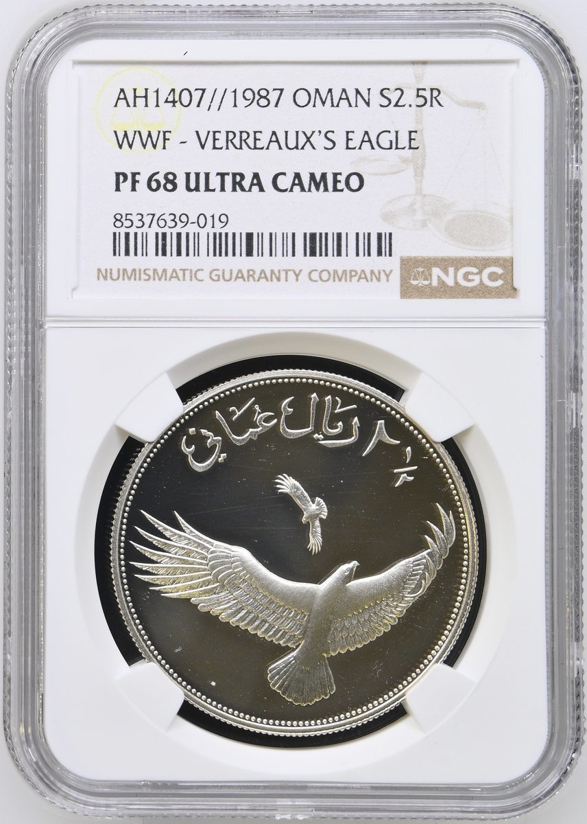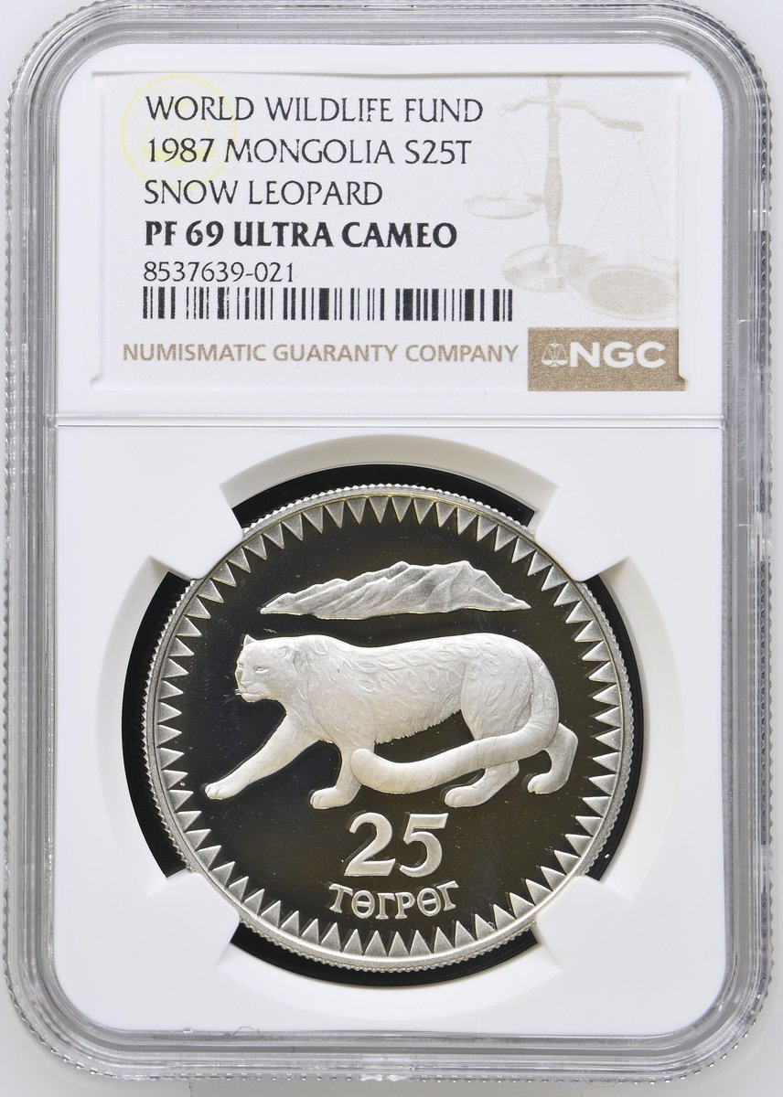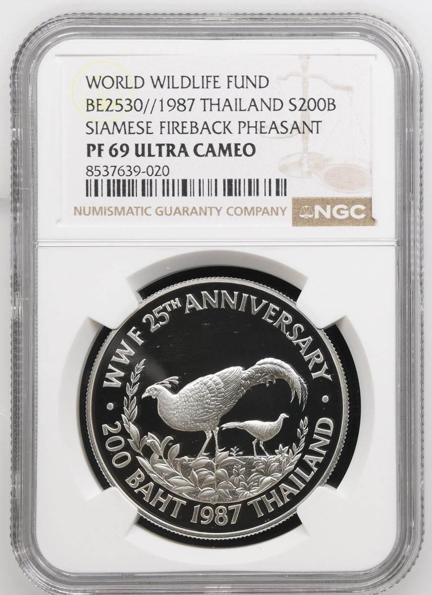 NGC PF69 ULTRA CAMEO | Bahrain, Isa bin Salman Al Khalifa (1961-1999), Proof Silver 5-Dinars, WWF 25th Anniversary, 1986, Llantrisant, [.925 Fine], draped bust left, rev. oryx, edge milled, 19.44g, 12h (KM 13), brilliant uncirculated, limited run of 25,000 struck, in NGC holder, graded PF69 ULTRA CAMEO (Cert. #8537639-018); NGC PF68 ULTRA CAMEO | Oman, Qaboos bin Said (1970-2020), Proof Silver 2½ Rials, WWF 25th Anniversary, 1987, Llantrisant, [.925 Fine], national arms, rev. eagle, edge milled, 28.28g, 12h (KM 73), brilliant uncirculated, limited run of 25,000 struck, in NGC holder, graded PF68 ULTRA CAMEO (Cert. #8537639-019); NGC PF69 ULTRA CAMEO | Thailand, Rama X (1946-2016), Proof Silver 200 Baht, WWF 25th Anniversary, 1987, [.925 Fine], draped bust left, rev. Siamese Fireback pheasant, edge milled, 23.18g, 12h (KM Y206), brilliant uncirculated, limited run of only 22,280 struck, in NGC holder, graded PF69 ULTRA CAMEO (Cert. #8537639-020); NGC PF69 ULTRA CAMEO | Mongolia, Proof Silver 25 Tögrög, WWF 25th Anniversary, 1987, [.925 Fine], snow leopard, rev. emblem of the People's Republic of Mongolia, edge milled, 28.28g, 12h (KM 50), brilliant uncirculated, limited run of only 25,000 struck, in NGC holder, graded PF69 ULTRA CAMEO (Cert. #8537639-021) (4)
