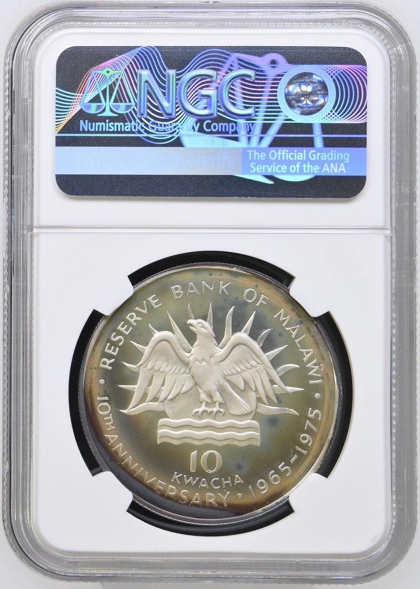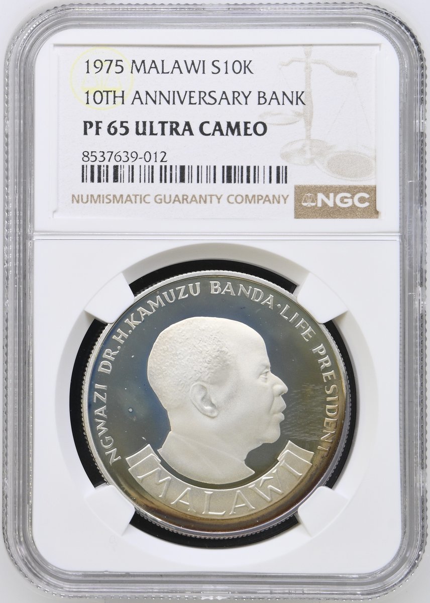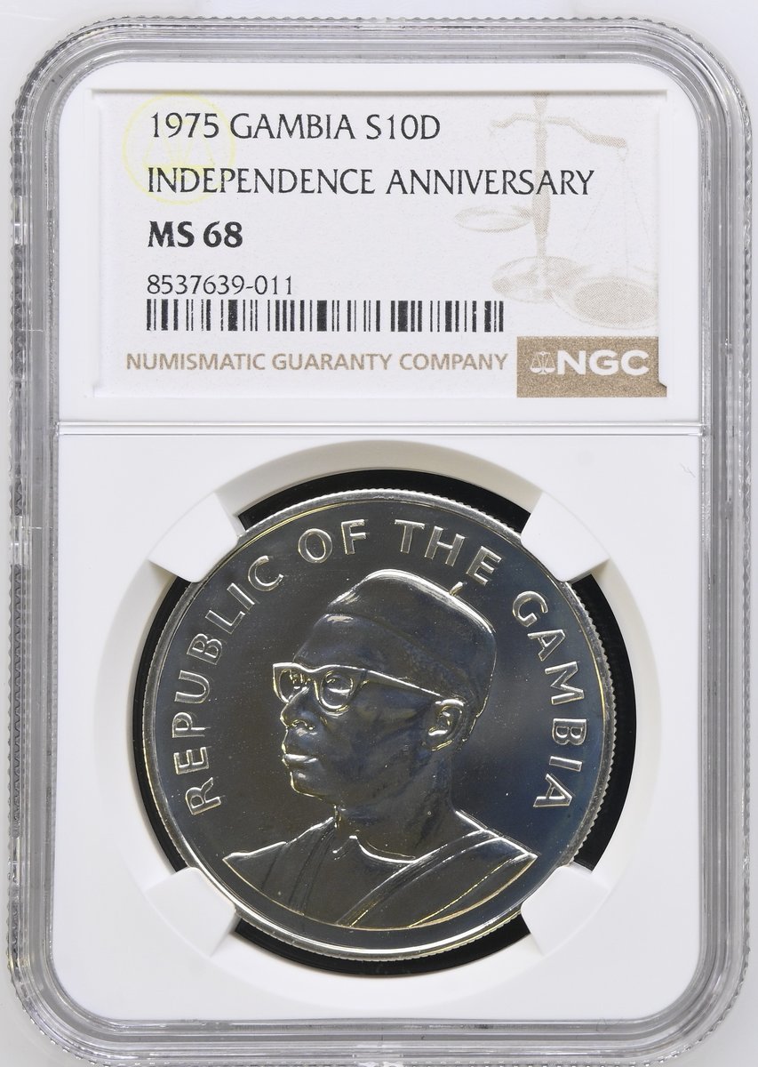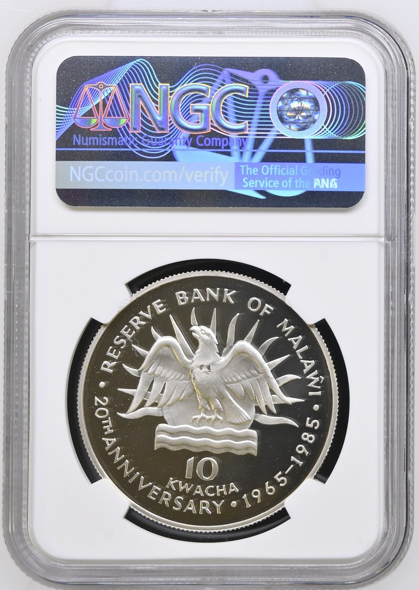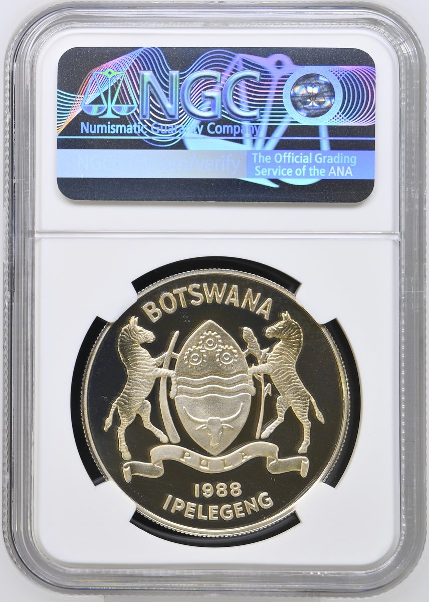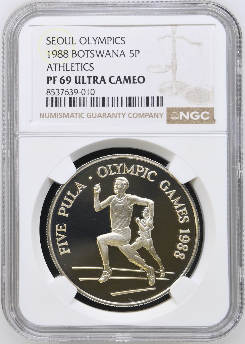 NGC PF69 ULTRA CAMEO | *Top Pop* | Botswana, Proof Silver Five-Pula, Upon the Olympic Games, 1988, Llantrisant, [.925 Fine], coat of arms, rev. Robert Elderton and other athletes running, edge milled, 28.28g, 12h (KM 21), brilliant uncirculated, limited run of only 25,000 struck and with Royal Mint Case of issue, in NGC holder, graded PF69 ULTRA CAMEO (Cert. #8537639-010) [*Joint Finest Certified*]; NGC MS68 | Gambia, Silver Ten-Dalasis, Upon the 10th Anniversary of Independence, 1975, Llantrisant, [.500 Fine], draped bust left, rev. coat of arms, edge milled, 28.28g, 12h (KM 16), brilliant uncirculated, in NGC holder, graded MS68 (Cert. #8537639-011); NGC PF65 ULTRA CAMEO | Malawi, Proof Silver Ten-Kwacha, Upon the 10th Anniversary of the Reserve Bank of Malawi, 1975, Llantrisant, [.925 Fine], bare head right, rev. coat of arms, edge milled, 28.28g, 12h (KM 14), some toning and frosting, brilliant uncirculated, limited pieces struck, with Royal Mint Case of issue, in NGC holder, graded PF65 ULTRA CAMEO (Cert. #8537639-012); NGC PF69 ULTRA CAMEO | Malawi, Proof Silver Ten-Kwacha, Upon the 20th Anniversary of the Reserve Bank of Malawi, 1985, Llantrisant, [.925 Fine], bare head right, rev. coat of arms, edge milled, 28.28g, 12h (KM 18), brilliant uncirculated, limited run of only 5,000 struck, with Royal Mint Case of issue, in NGC holder, graded PF69 (Cert. #8537639-013) (4)