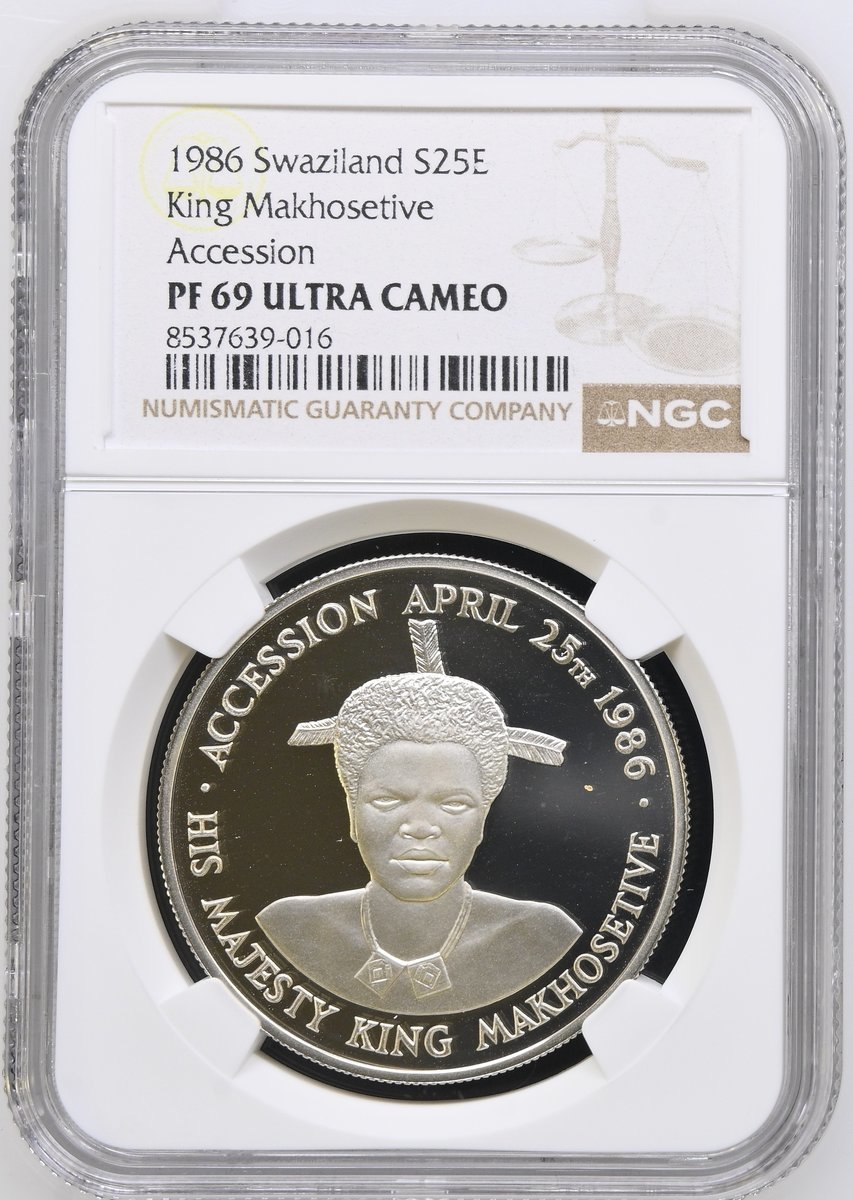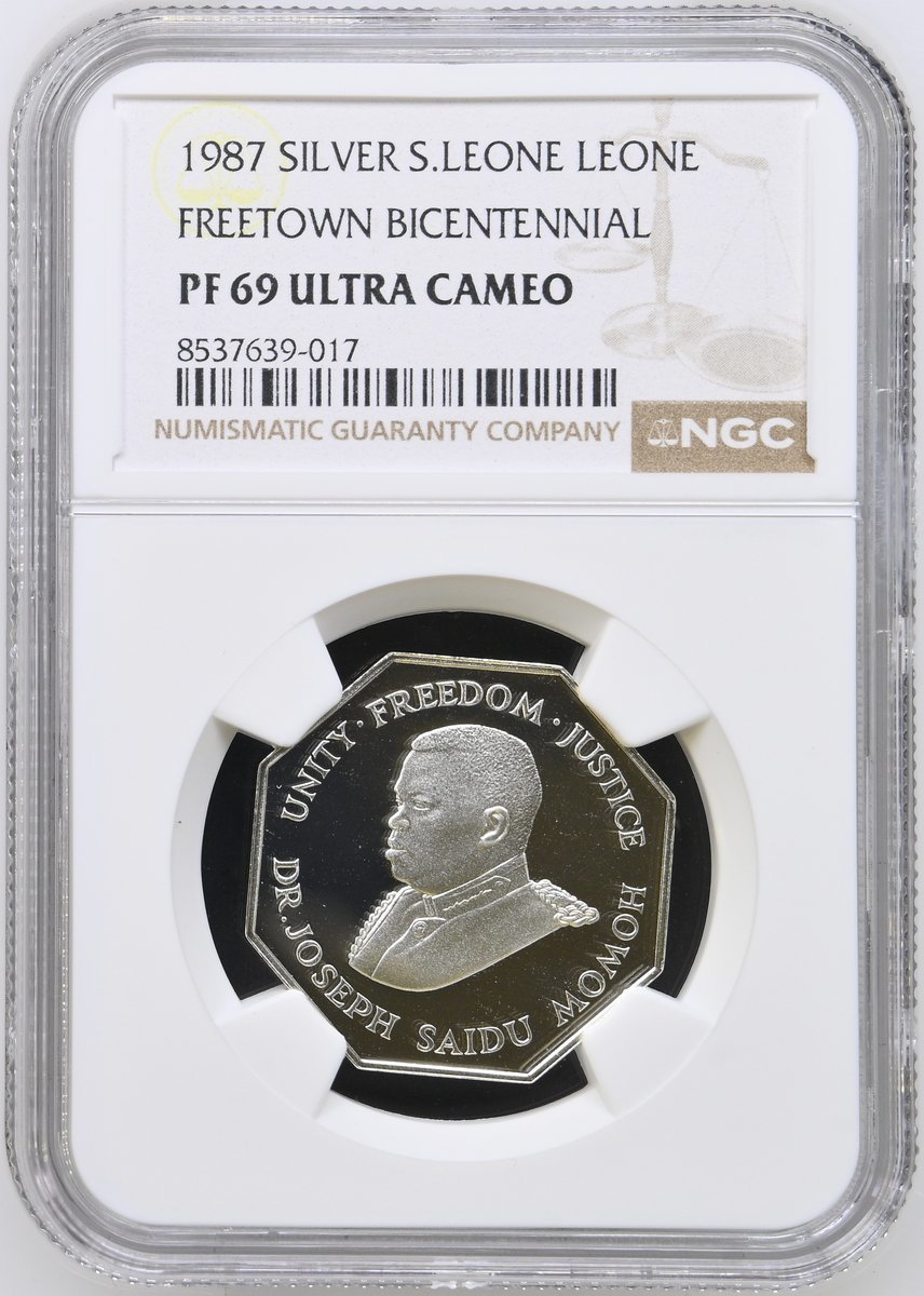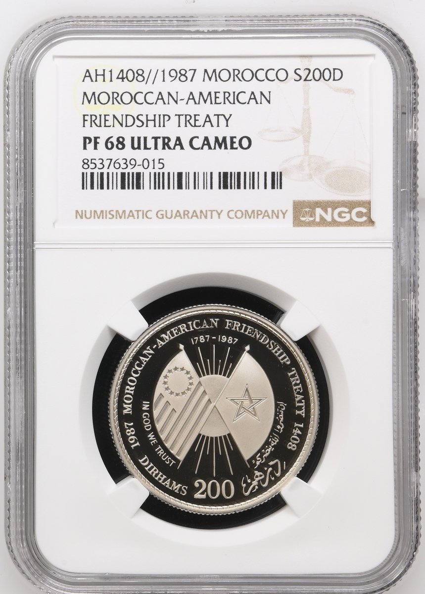 NGC PF68 ULTRA CAMEO | Morocco, Proof Silver 200 Dirhams, Upon the Bicentenary of the Moroccan-American Friendship Treaty, 1987, Llantrisant, [.925 Fine], bare head left, rev. flags in saltire, edge milled, 15.00g, 12h (KM Y81), brilliant uncirculated, limited run of 5,000 struck, with Royal Mint case of issue, in NGC holder, graded PF68 ULTRA CAMEO (Cert. #8537639-015); NGC PF69 ULTRA CAMEO | Swaziland, Proof Silver 25 Emalangeni, Upon the Accession of King Makhosetive, 1986, Llantrisant, [.925 Fine], facing bust, rev. facing bust, edge milled, 28.28g, 12h (KM 37), brilliant uncirculated, limited run of only 2,500 struck, with Royal Mint Case of issue, in NGC holder, graded PF69 ULTRA CAMEO (Cert. #8537639-016); NGC PF69 ULTRA CAMEO | *Top Pop* | Sierra Leone, Proof Silver One Leone, Upon the Bicentenary of Sierra Leone, 1987, Llantrisant, [.925 Fine], draped bust left, rev. logo of anniversary, edge plain, 9.5g, 12h (KM 40), brilliant as struck, limited run of 3,000 struck, with Royal Mint Case of issue, in NGC holder, graded PF69 ULTRA CAMEO (Cert. #8537639-017) [*Joint Finest Certified*] (3)