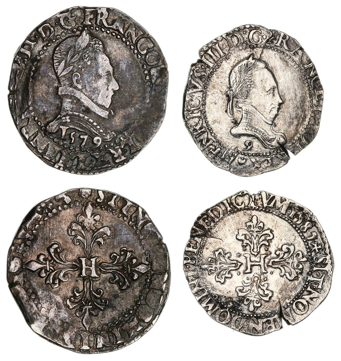 France, Henry III (1574-1589), Franc au col plat, 1579 L, Bayonne, laureate and draped bust right, with plain collar, rev. floriated cross, lys at end, H at centre, 13.80g, 1h (Dupl. 1130), soft in parts, toned, good fine; Half-Franc au col plat, 1587 9, Rennes, as before, 6.88g, 5h (Dupl. 1131), cleaned and with striking splits, fine (2)